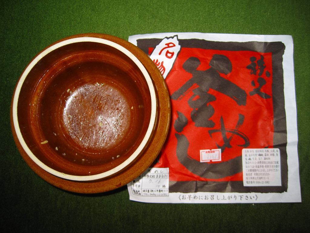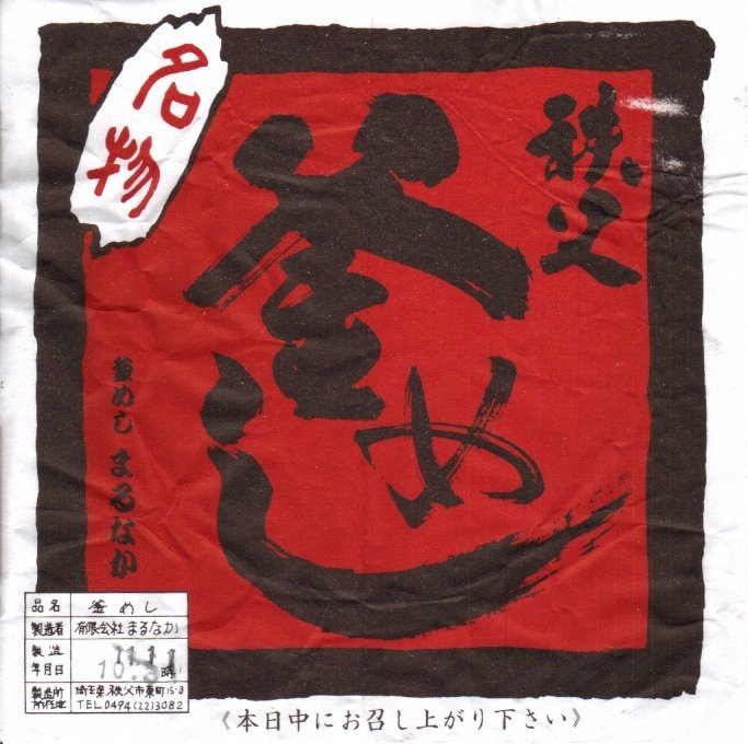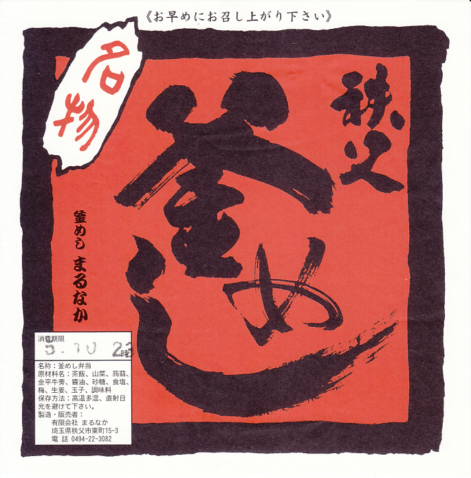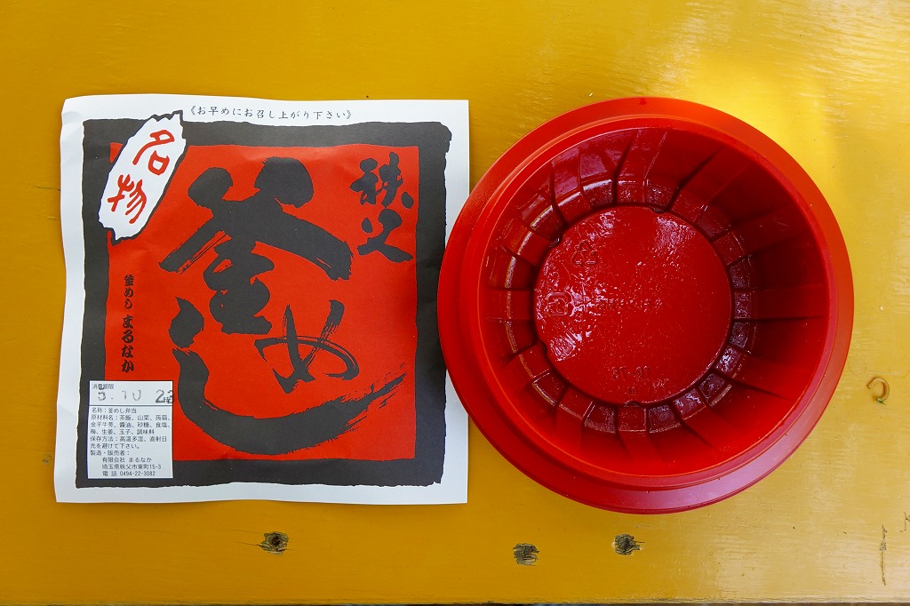 フタまで陶製の小ぶりで本格的な釜を容器に使用、味付け御飯の上を鶏肉・山菜・錦糸卵・こんにゃく・栗・梅・紅生姜で覆う。紅生姜の強い匂いが他の具の香りや味をすっかり消してしまっているのが残念。西武秩父駅は池袋からの特急レッドアローが発着する秩父観光の玄関口だが、駅弁屋は朝は開いていなく夕方は売り切れているため、観光のついででの駅弁の入手はなかなか難しい。特に釜めしは。なお、駅弁の名称は駅売店の掲示による。西武秩父駅に駅弁ありと雑誌やテレビが発信し始めた頃には、なくなっていた感じ。