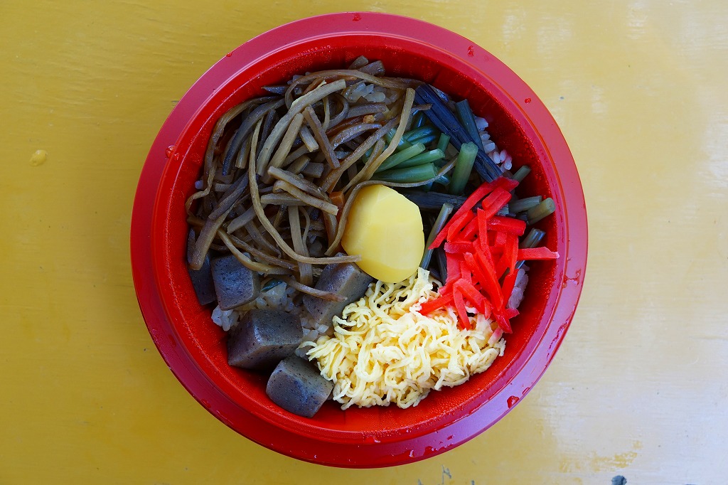 平たく赤いプラ製の惣菜容器に透明なふたをして、この掛紙をかけて、ビニールひもで十字にしばる。中身は茶飯の上をクリ、山菜、こんにゃく、きんぴらごぼう、紅生姜、錦糸卵で覆うもの。駅弁としては安い価格で、実は具に肉も魚も使っておらず、山の中の駅の駅弁らしい感じ。価格はこのスタイルになってずっと500円であったが、2014年4月の消費税率改定に伴い515円に値上げ。