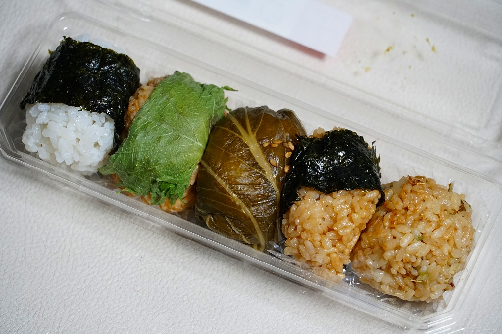 2024年に西武秩父駅で購入。ここではかつて「わらじかつ弁当」やおにぎり弁当や幕の内弁当に岩魚すしなどが売られ、リニューアル前は釜飯の駅弁も売られたが、上記のフードコート弁当を残してすべてなくなり、おにぎりやパンの販売になっていた。これはその店内に加え、通路の真ん中で客を呼んでいた商品。たまご焼、豚味噌、しゃくし菜、お醤油、しゃくし菜炒飯で5個の小さな飯球を、惣菜向けの透明プラ容器に並べ、商品名とその説明イラストを記したシールを貼る。シールでは商品名が「秩父おむすび」と読め、レシートには「おにぎり5個パック」とあった。まるで駅弁はいまどき古臭いと決別したような、土産物店のお惣菜。調製元に関する情報は発信されていない。