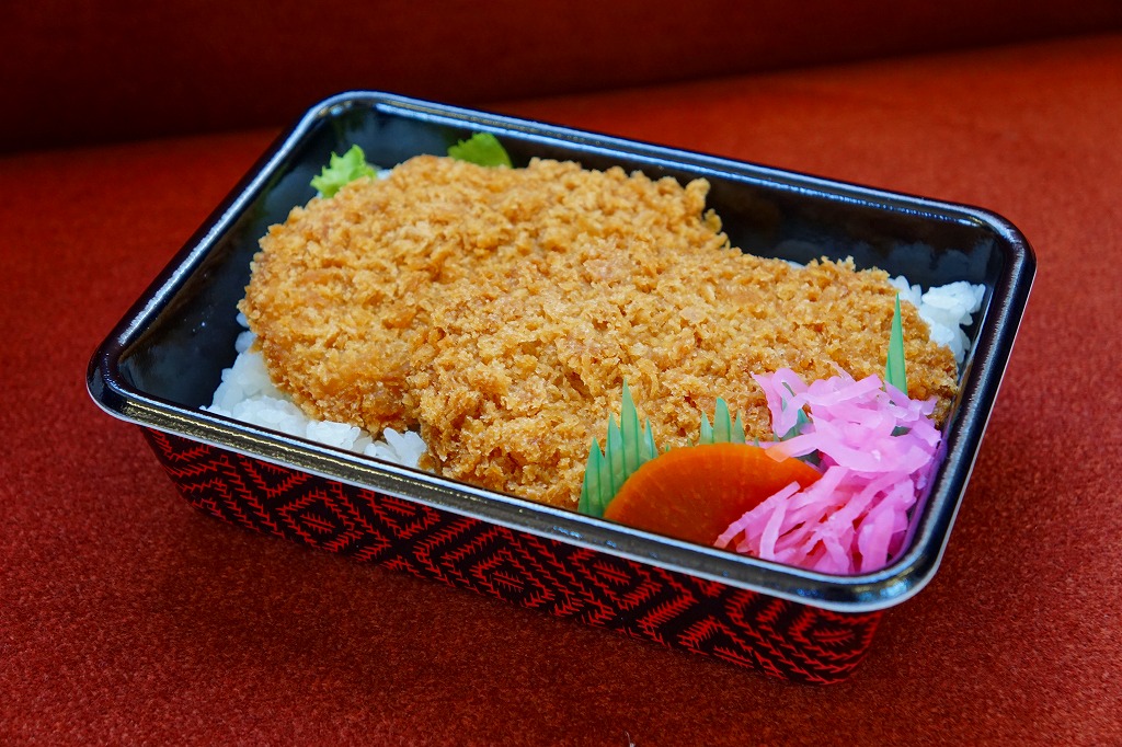 西武秩父駅で幕の内弁当やおにぎり弁当を売った調製元の、秩父名物わらじかつ弁当。弁当そのものに、名称や内容などの表示はなく、容器の見た目はまるでホカ弁。中身は白御飯にロースカツのソース漬け2枚を載せる、正しい姿のわらじかつ丼。B級グルメらしからぬ、箸で切れる柔らかいカツと整った見栄えを備えていた。