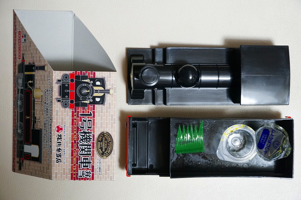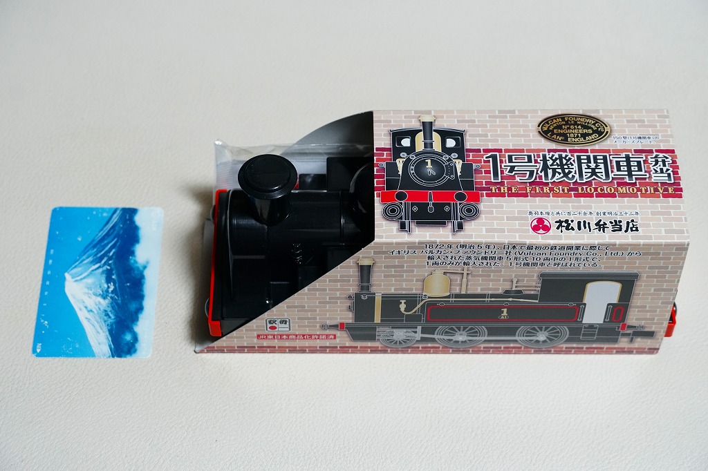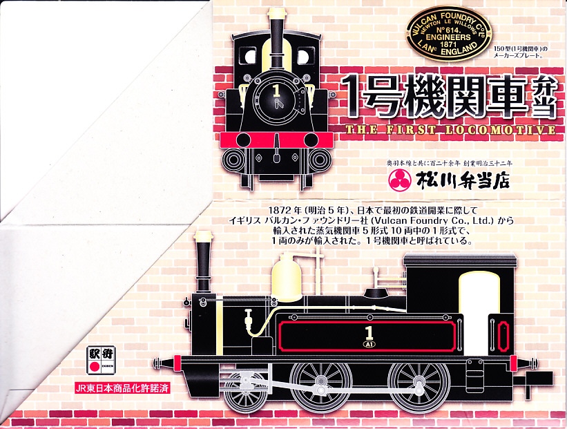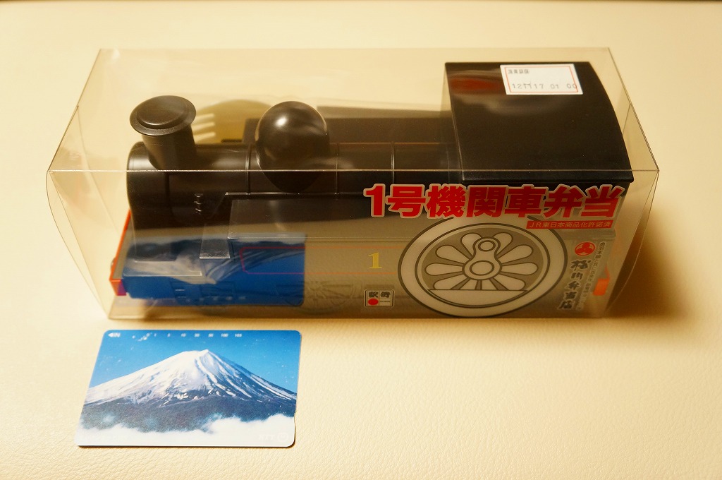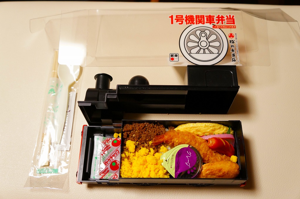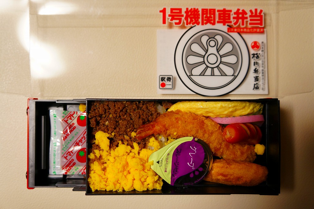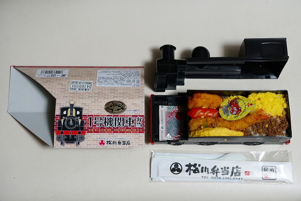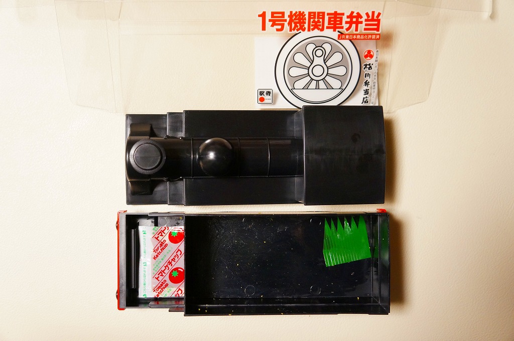 上記の駅弁「1号機関車弁当」の、2012(平成24)年の発売当時の姿。機関車の容器は2022年4月頃まで、紙のスリーブでなく透明なプラ箱に入れていた。中身も機関車の前後で具の配置が異なるが、内容は変わらない。
