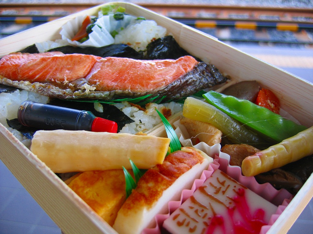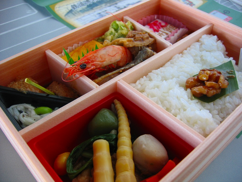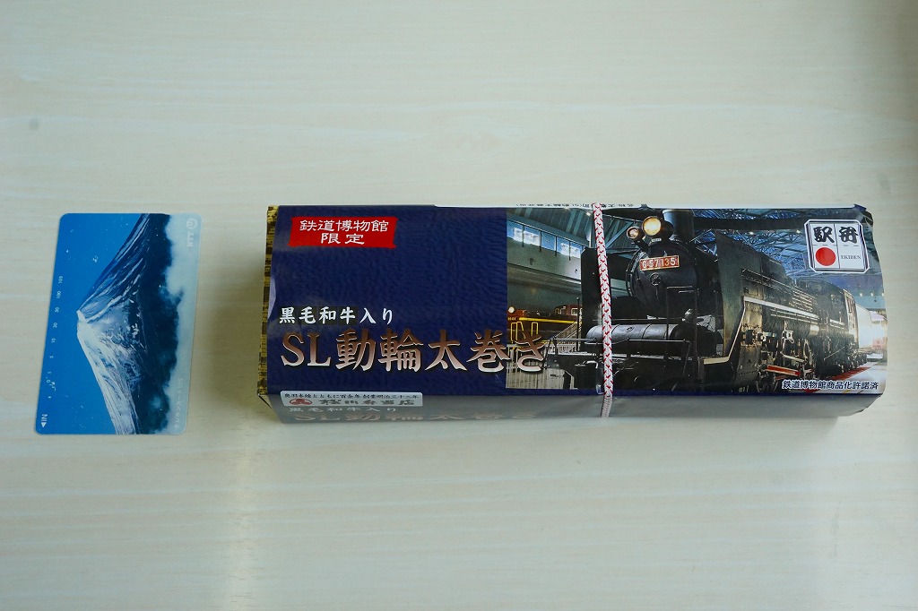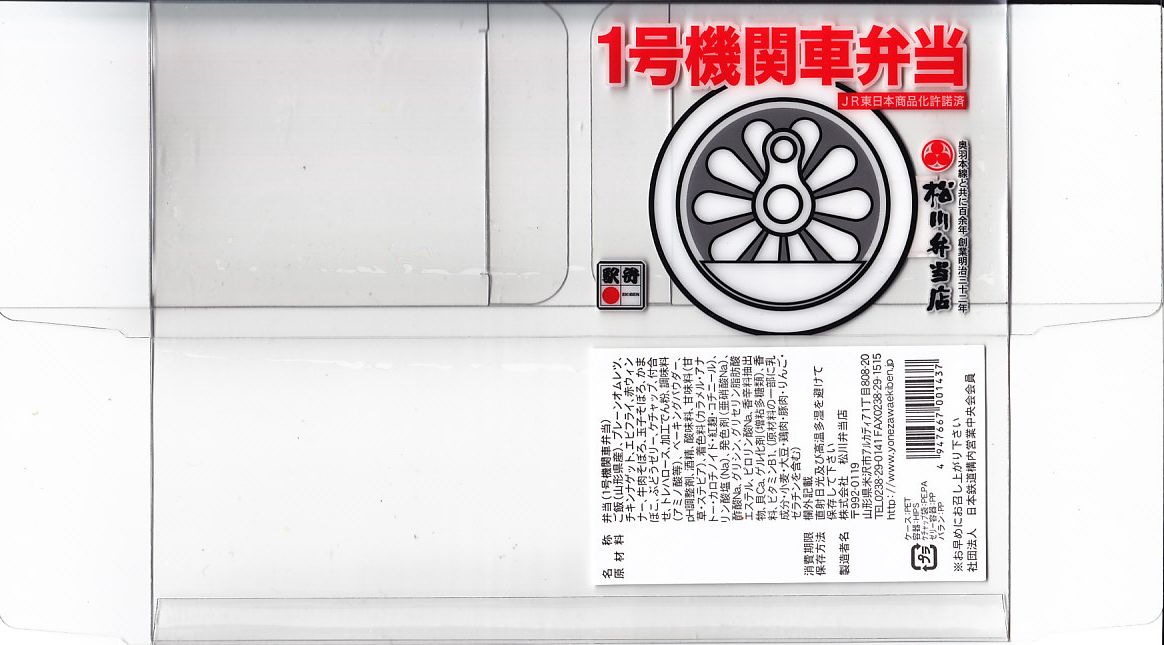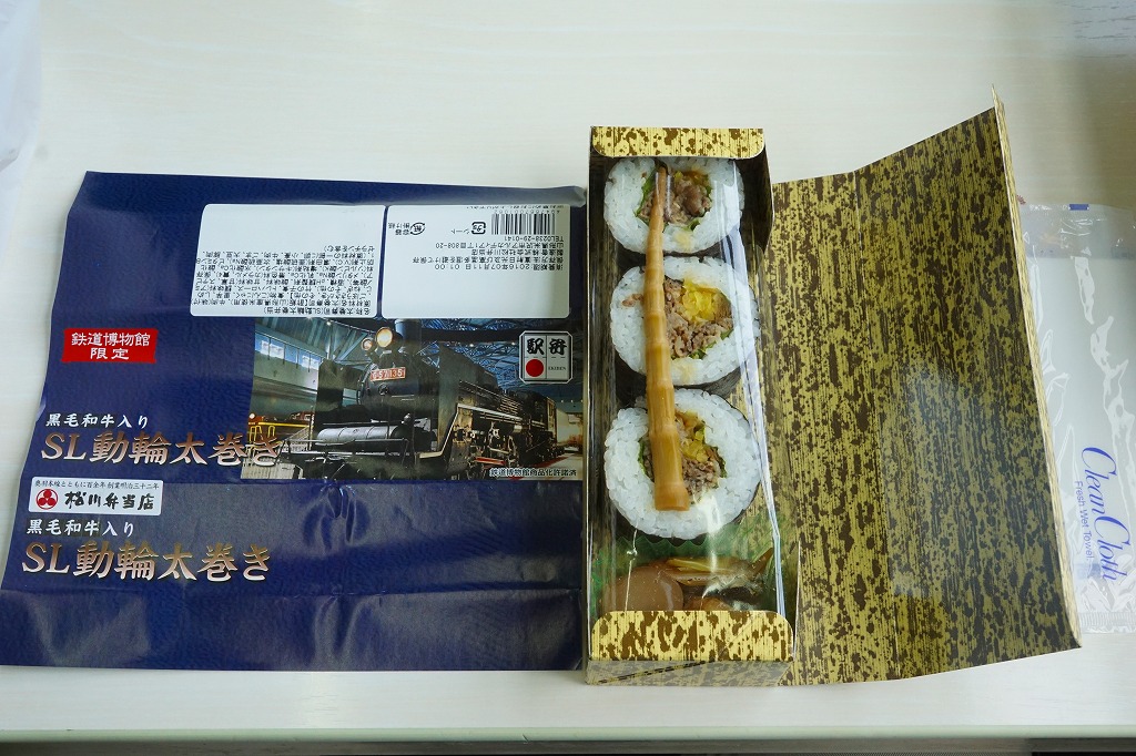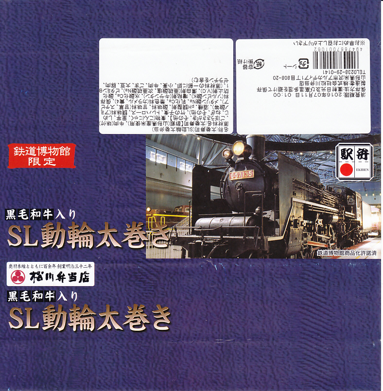 鉄道博物館の開館3周年を記念して、2010(平成22)年の秋までに発売か。調製元は、山形県は米沢駅の駅弁屋。館内展示の蒸気機関車の写真を載せる掛紙を巻いた、竹皮柄の細長いボール紙の箱に、太巻きを3個並べ、ヒメタケを置き、芋煮を添える。この太巻きとヒメタケで、SL(蒸気機関車)の動輪とロッドを表現したのだろう。実際に掛紙のC57形式蒸気機関車は、直径1.75メートルの動輪を3軸備える。これはお手軽なアイデア作。価格は2010年の発売時で500円、2016年の購入時で550円。2018年の秋頃に終売か。