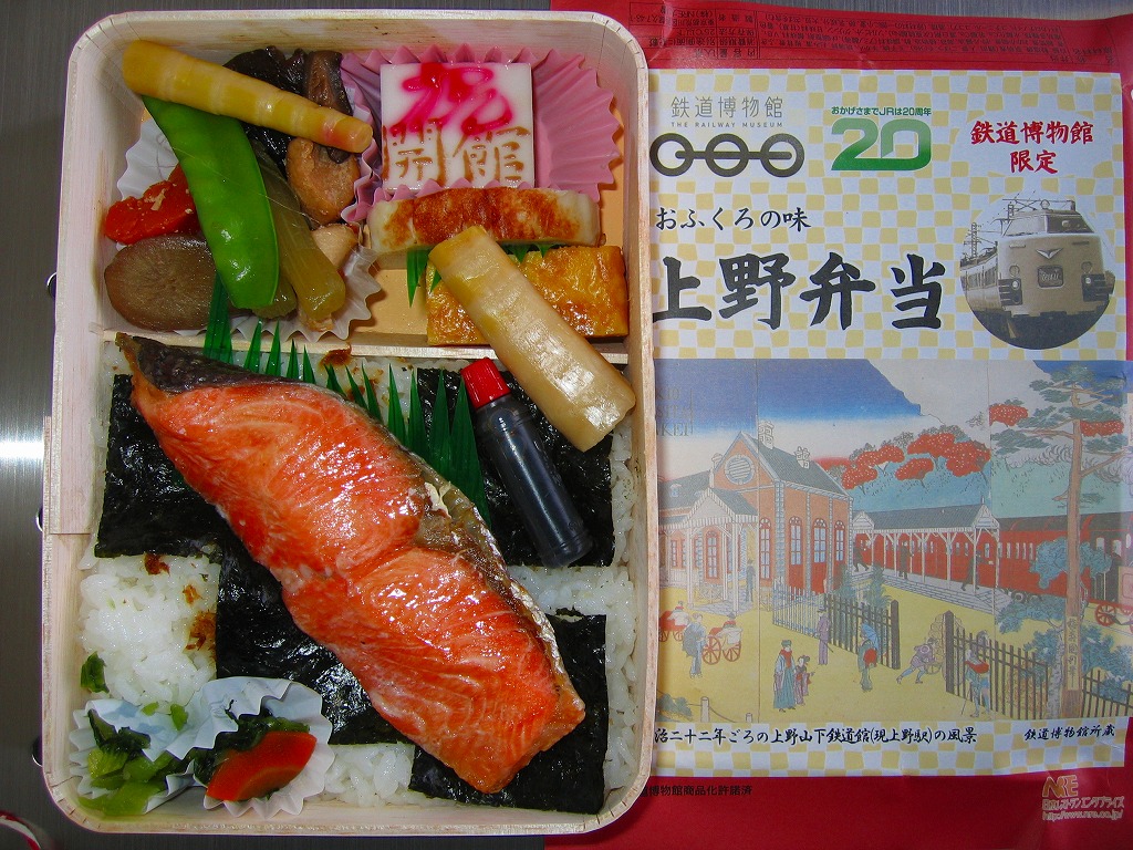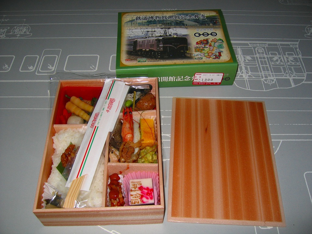 2007(平成19)年10月14日の鉄道博物館の開館とともに発売された、博物館内限定販売のお弁当。価格も内容も掛紙のデザインも、基本的には東京駅弁「東日本味の選りすぐり弁当 うまいもん」と同じもので、掛紙右下の絵柄が共通であることがヒント。掛紙に鉄道博物館や人気機関車の写真に鉄道博物館のロゴマーク等が付き、中身のずんだもちが「祝開館」のようかんに差し替えられていることが相違点。数か月間の販売か。