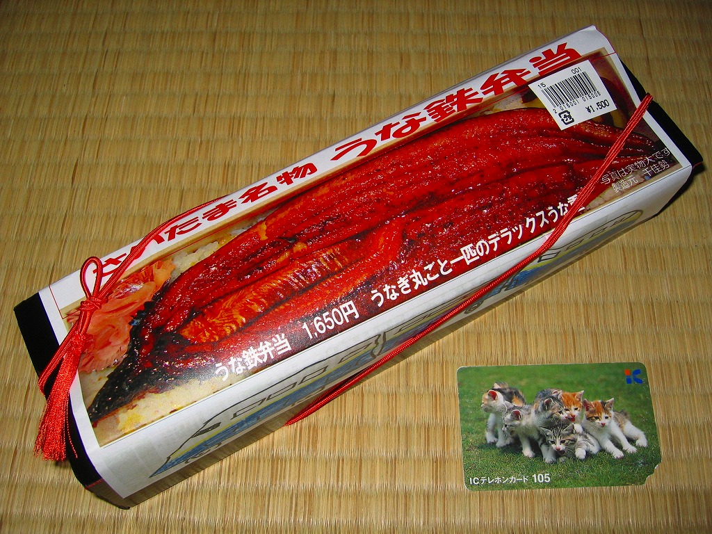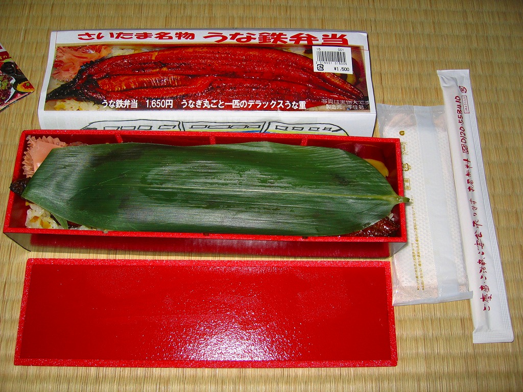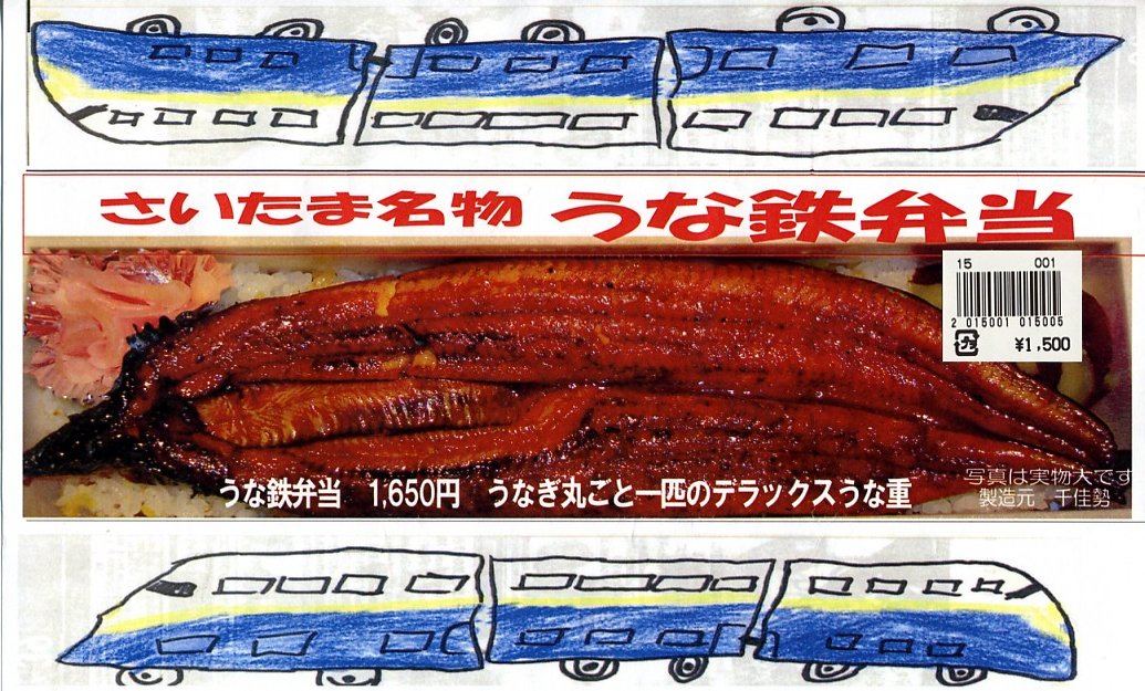 鉄道博物館の最寄り駅で売られたお弁当。黒く細長い容器に、割りばしとおしぼりといくつものチラシを置いて、中身の写真と新幹線の児童絵を描いた掛紙を巻く。中身は白ゴマと刻みタクアンを混ぜた酢飯にウナギ蒲焼を1匹載せて、甘酢生姜とサツマイモを添えるもの。掛紙には1,650円の価格が見えるが、常に1,500円で販売した模様。
