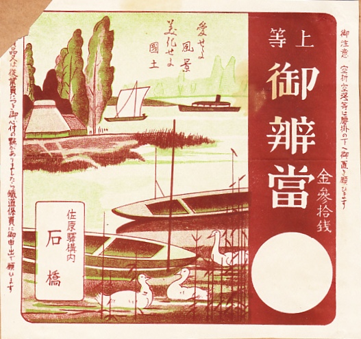 おそらく1930年代、昭和10年前後のものと思われる、昔の佐原駅弁の掛紙。おかずの掛紙には、今もこの地域の観光資源である水郷の、木舟や帆掛け舟に茅葺き屋根の家屋がある昔の風景と、「愛せよ風景 美化せよ国土」という当時の鉄道省の当選標語を記す。御飯の掛紙はおそらく各社共通で、花便りとして鉄道省の東京鉄道局管内の梅や桜の名所の一部を路線図で示す。佐原駅の駅弁は第二次大戦後に残らなかったようだ。
