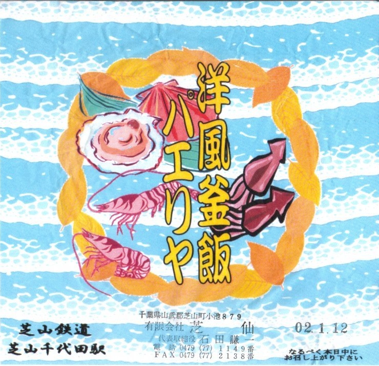 1976(昭和51)年3月19日の調製と思われる、弁当の掛紙。調製元は黒磯駅の駅弁屋で、商品は1975年頃から2005年の駅弁撤退まで黒磯駅などで売られた、栗型の容器に茶飯を詰めて、鶏肉や栗や山菜などで覆ったお弁当だった。しかし調製元の所在地が千葉県船橋市とある。当時のフタバ食品は栃木県外の東京やその近郊でも弁当を調製し販売していたようで、平成時代にも東武浅草駅の駅弁屋と紹介された。東武船橋駅にも弁当売店があったので、そこでも売られたのではないだろうか。商品そのものは「那須高原」を名乗るくらいなので、黒磯駅の駅弁と同じだったのだろう。当時の価格は500円か。