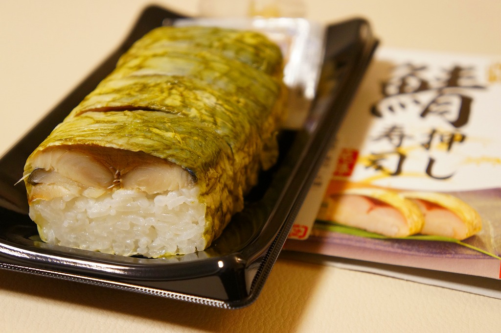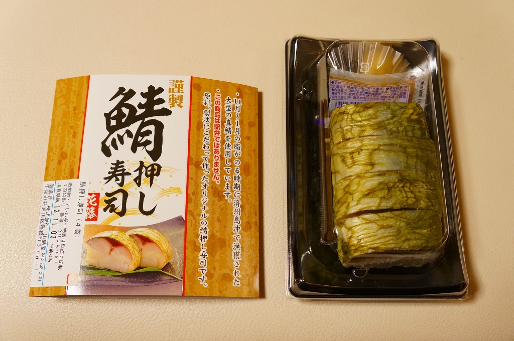 酢飯と焼かない締めサバを貼り合わせて昆布で巻いた棒寿司を、惣菜向けプラ製トレーに4カット分並べ、ガリと醤油も詰めてボール紙の枠にはめる。スーパーでの駅弁催事で「この商品は駅弁ではありません」と赤い文字で明記して販売するという、なぜここにあるのか、そんなことをするのか不思議な商品。味は同じような駅弁と、あまり変わらない。調製元は千葉市内のパン屋さん。
