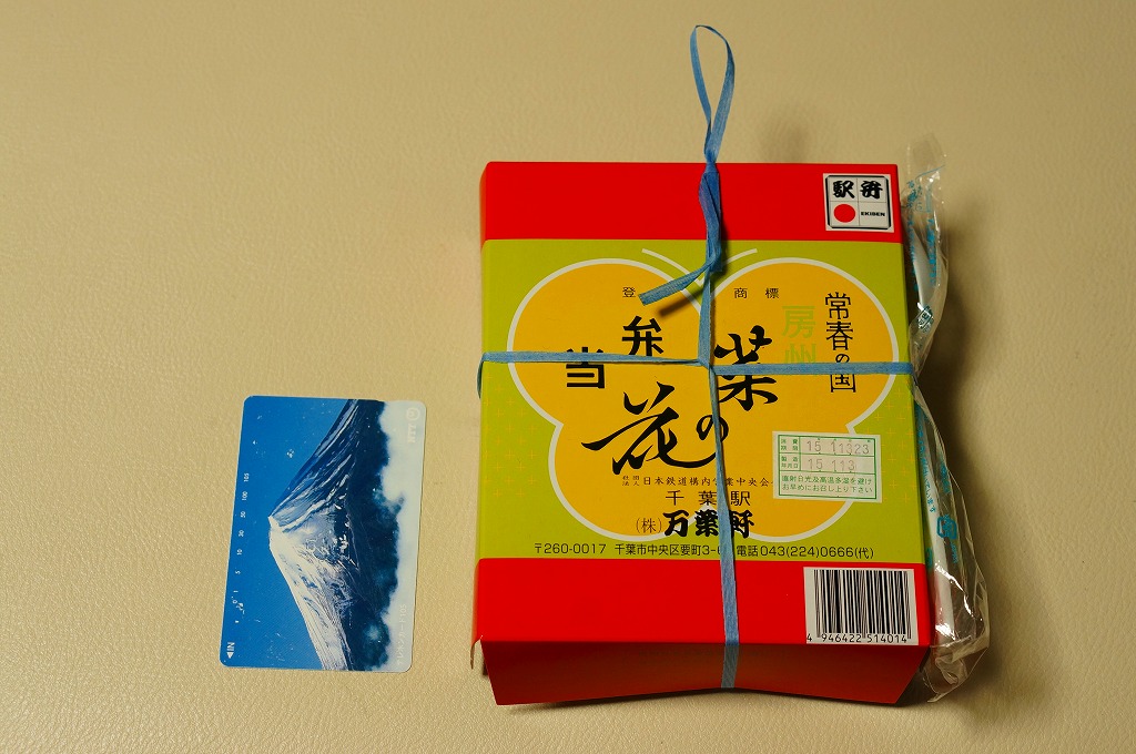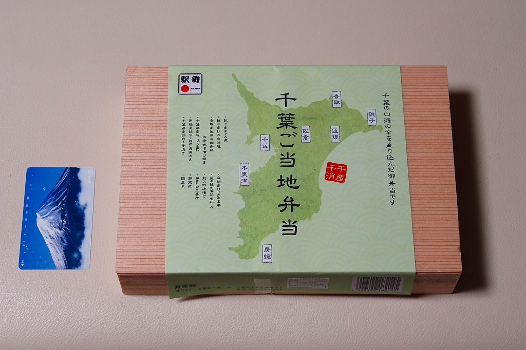 2014(平成26)年9月までに発売か。千葉県土のシルエットに地名やおしながきを書いた緑色の掛紙を使う。中身は幕の内タイプで、白御飯の上にはアサリ生姜煮が載り、おかずのマグロ煮とサンマ蒲焼は銚子産、鶏味噌漬焼は香取産、しゅうまいと玉子焼は千葉県産、鶏つくねは匝瑳(そうさ)産、ひじきは房総産など。そんな感じで、掛紙のおしながきによると、それぞれが千葉の山海の幸だそうな。とはいえ、駅弁大会に出てくるタイプでない、味も中身も弁当として実用的な千葉満載。2020年の春頃に、ひっそりと終売か。