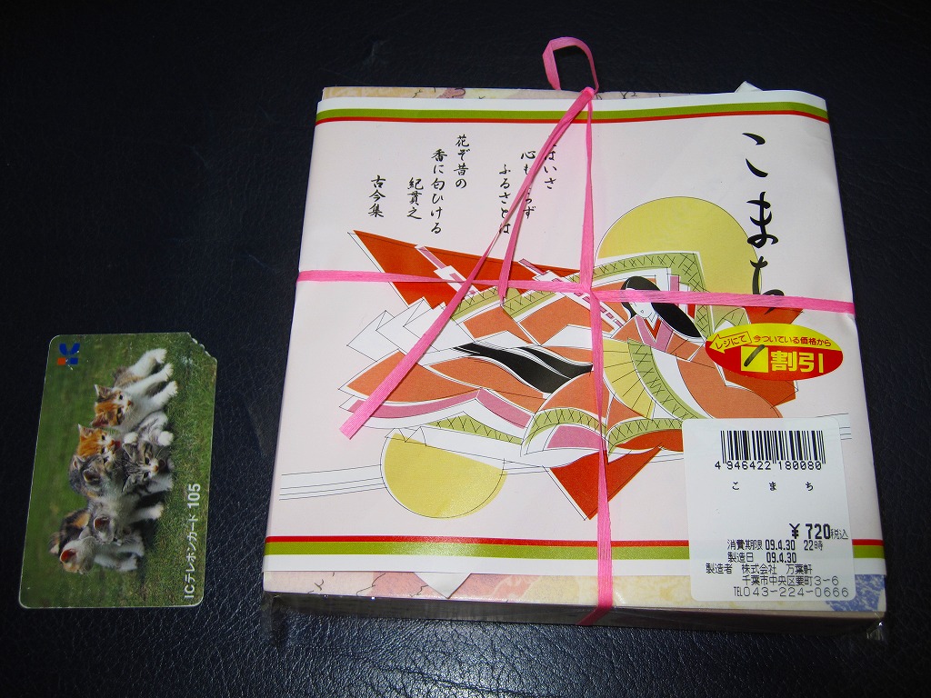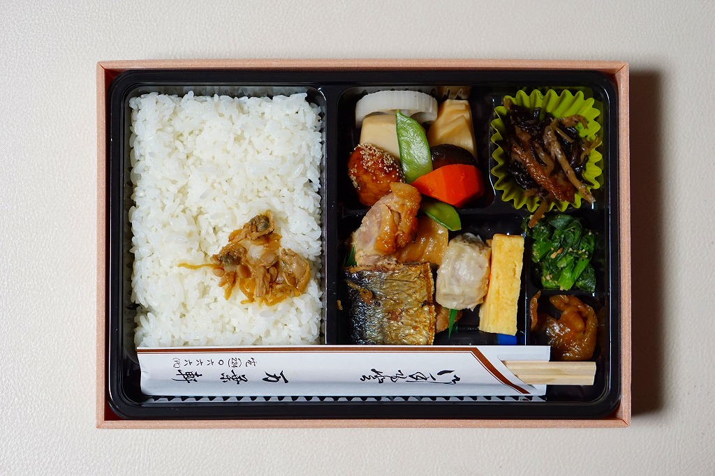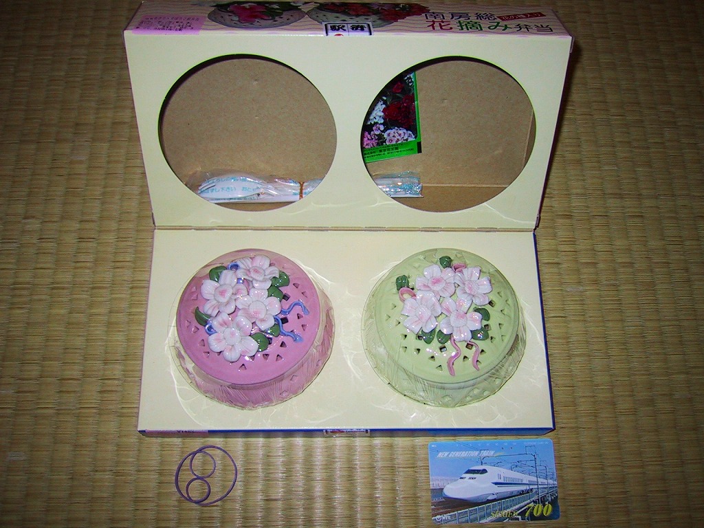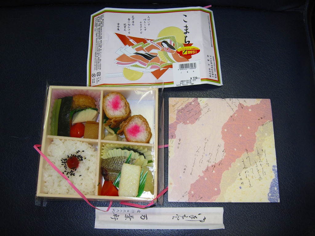 千葉駅の女性向け駅弁だそうな。小さな正方形の容器に、紫式部や柿本人麻呂の和歌が記される同じ素材のふたをして、紀貫之の歌と小野小町のイラストを描いた掛紙をかけて、桃色のひもでしばる。松花堂タイプに区画された中身はそれぞれ、日の丸御飯、カボチャや高野豆腐などの煮物と鶏肉レンコン挟み揚げ、半身のおいなりさん2個、銀ムツ西京焼とイカ白焼と菜の花和えなど。