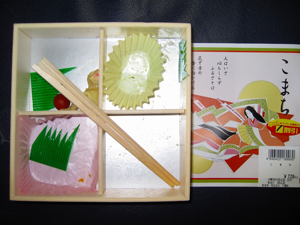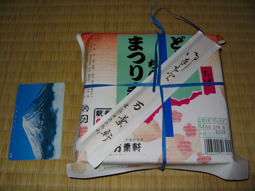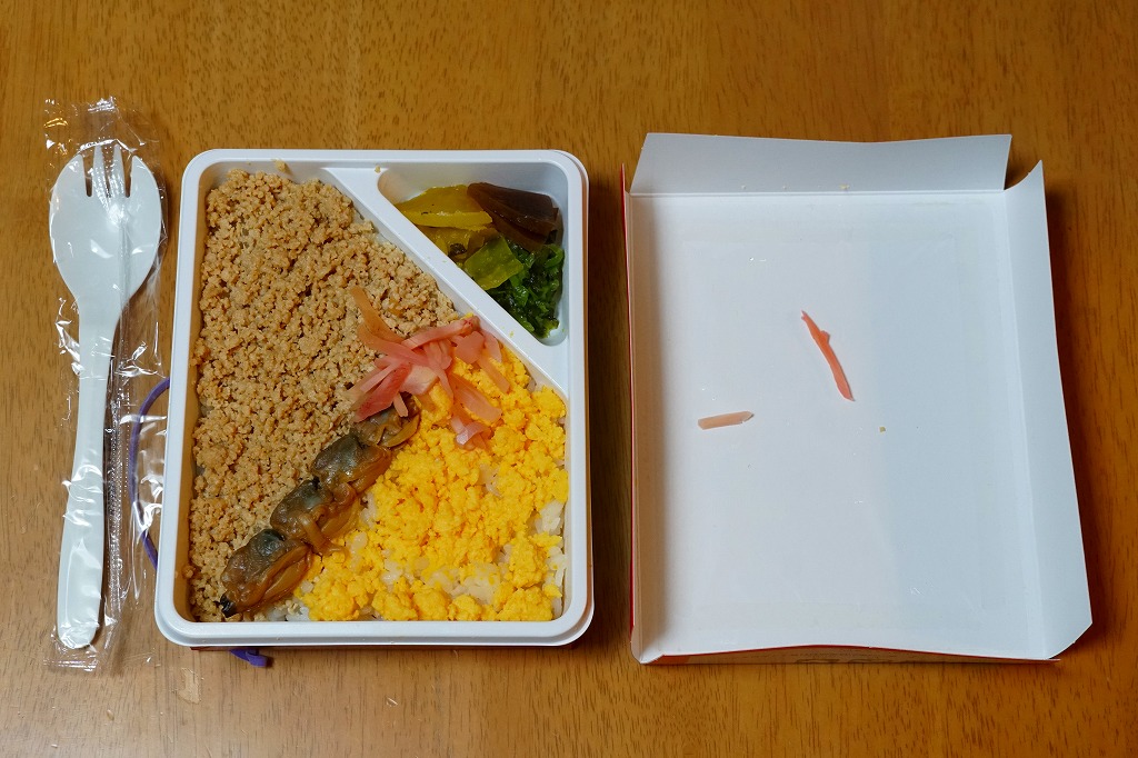 上のように書けば上品さや風流さが薫ってきそうだが、中身を見ても食べても安物風。こんなチープさが多くの千葉駅弁の特徴であり、世界有数の国際空港で売られていても何も変わらない。分量はやや少なめ。2014年頃までの販売か。