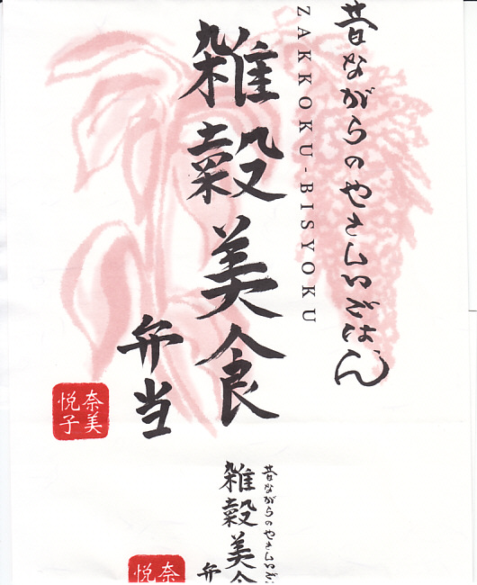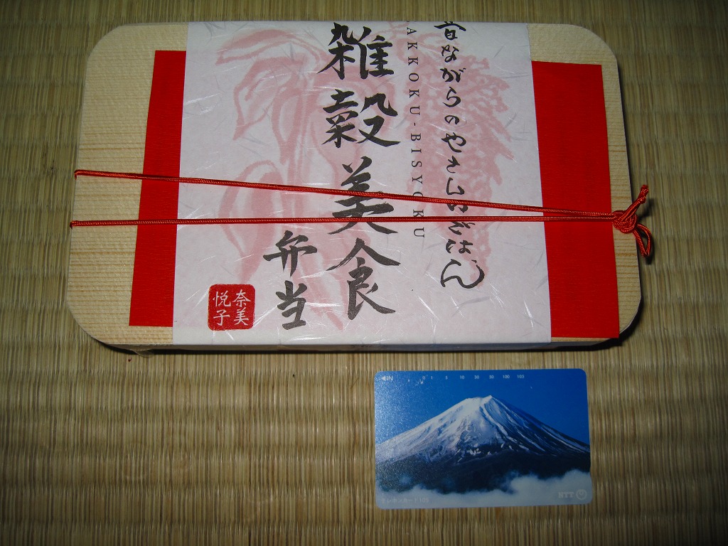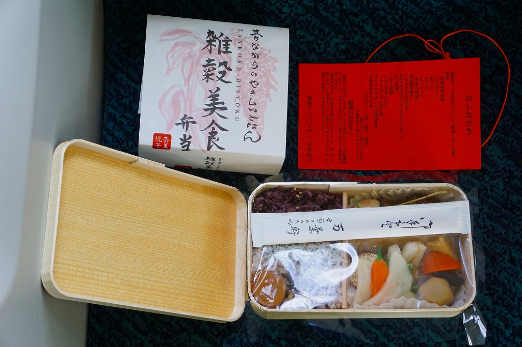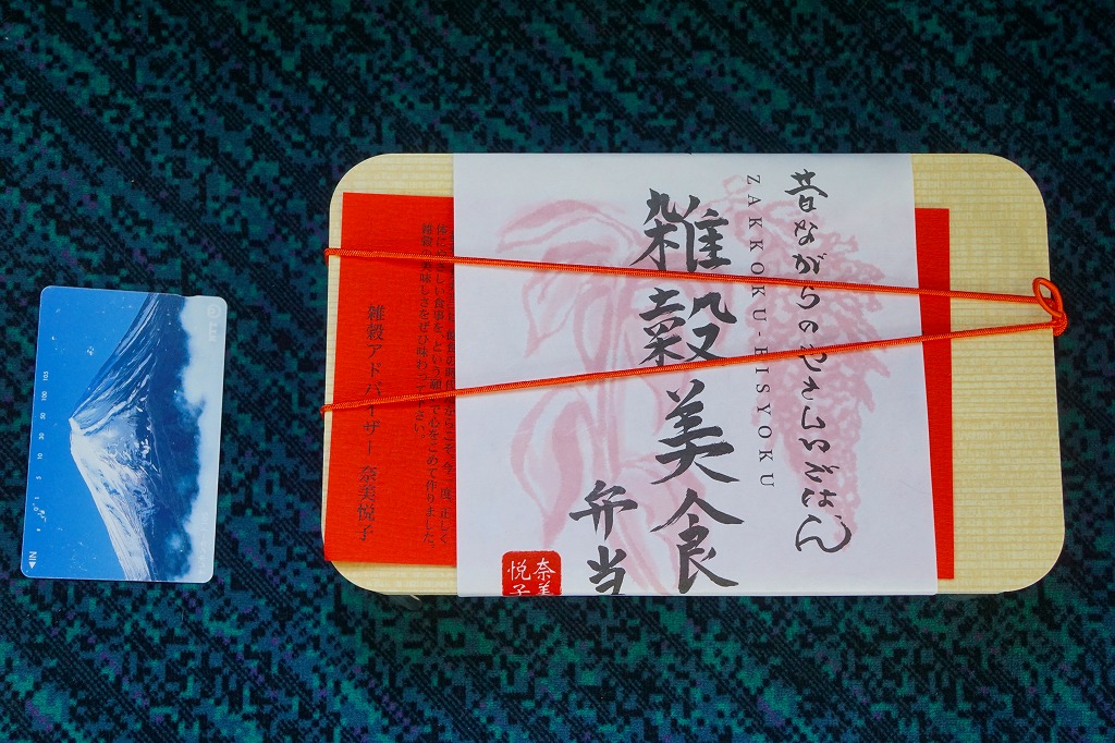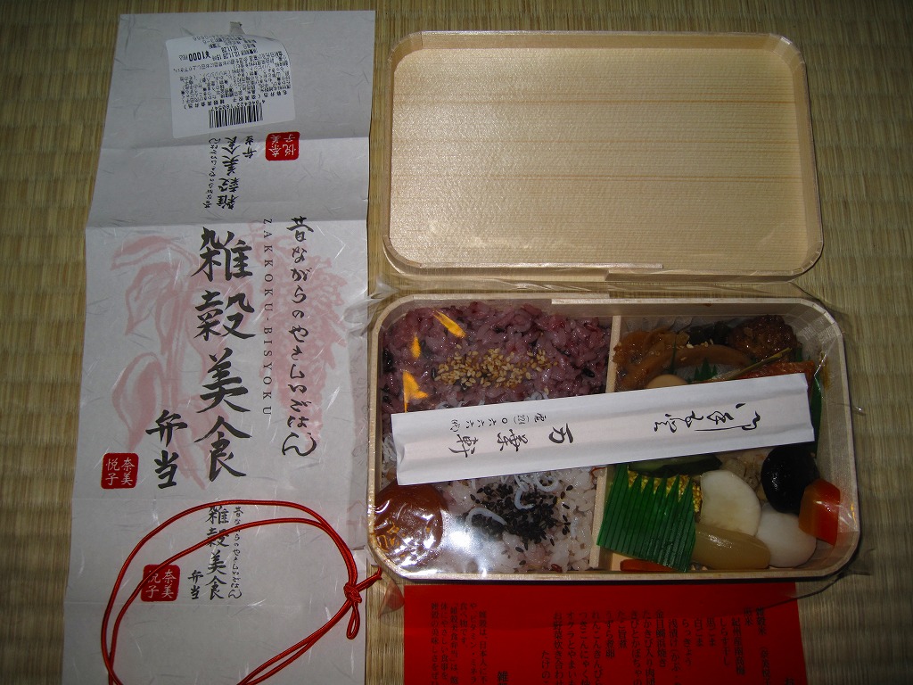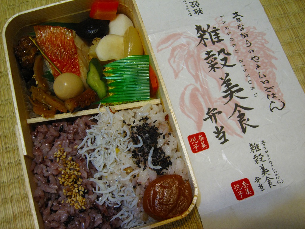 女優で「雑穀アドバイザー」を名乗る奈美悦子氏の監修により、2010(平成22)年10月1日に発売。経木枠の小柄な容器に、商品名を墨字書きした掛紙を巻く。中身は朱色の紙のお品書きにたくさん書かれるとおり、シラスとゴマをかけた監修者ブレンドの雑穀米「健康で美人」と黒米と南高梅、キンメダイ浜焼き、肉団子、かぼちゃコロッケ、タコとウズラ卵の串、タケノコやサトイモなどの煮物、レンコンきんぴらなど。