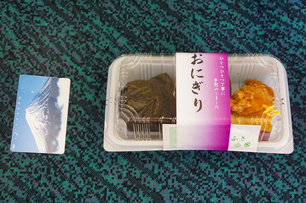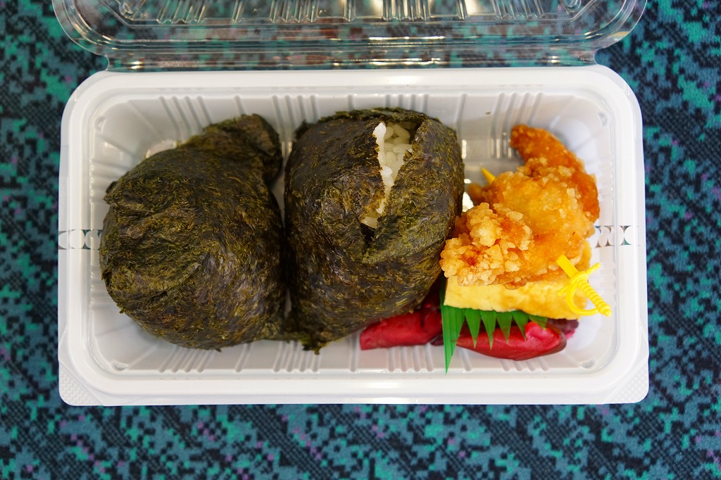 千葉駅に唯一残った駅弁売店で買えた、駅弁屋が作るおむすび。小ぶりな梅と昆布のおにぎり各1個と鶏唐揚、玉子焼、柴漬けをプラ容器に詰め、商品名を書き駅弁マークのない紙帯を締めていた。