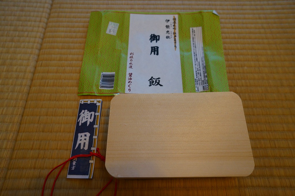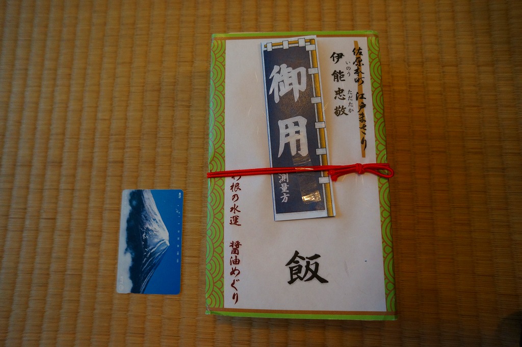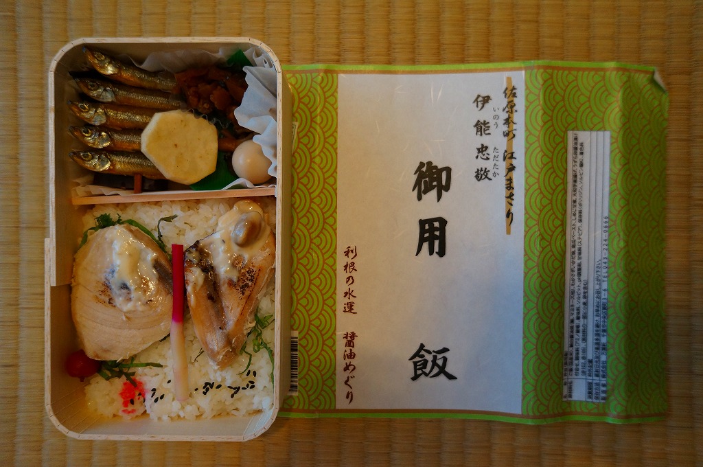 2012(平成24)年1月の京王百貨店の駅弁大会で輸送販売されたお弁当。他の千葉駅弁でも見掛ける細身な長方形の木製枠の容器に、和紙風の掛紙を巻いてゴムで留め、伊能忠敬が測量時に用いた「御用旗」を模したしおりをセロハンテープで貼り付ける。