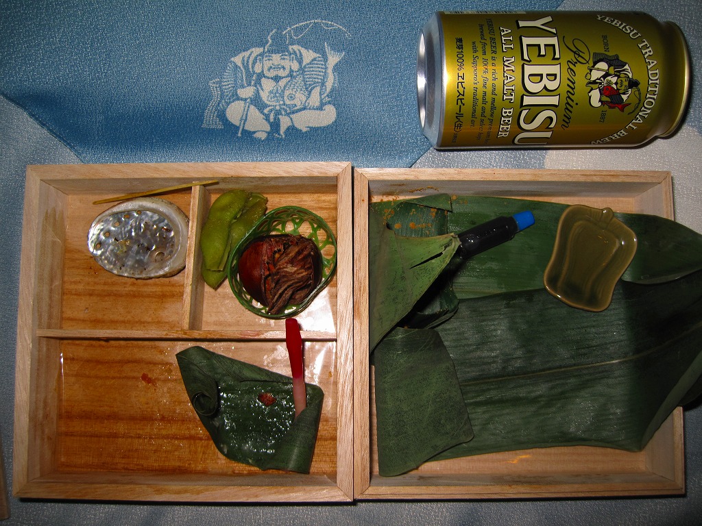サッポロビールの企画により、2009(平成21)年7月18日から8月2日まで、東京、千葉、木更津の各駅で合計1,000個が販売された駅弁。標記の駅弁大会で早くも復刻販売が実施された。えびす様が描かれた空色の風呂敷で、正方形の二段重ねの木製容器を包む。中身は次のとおり。ヱビスビールの350ml缶も付いてきた。