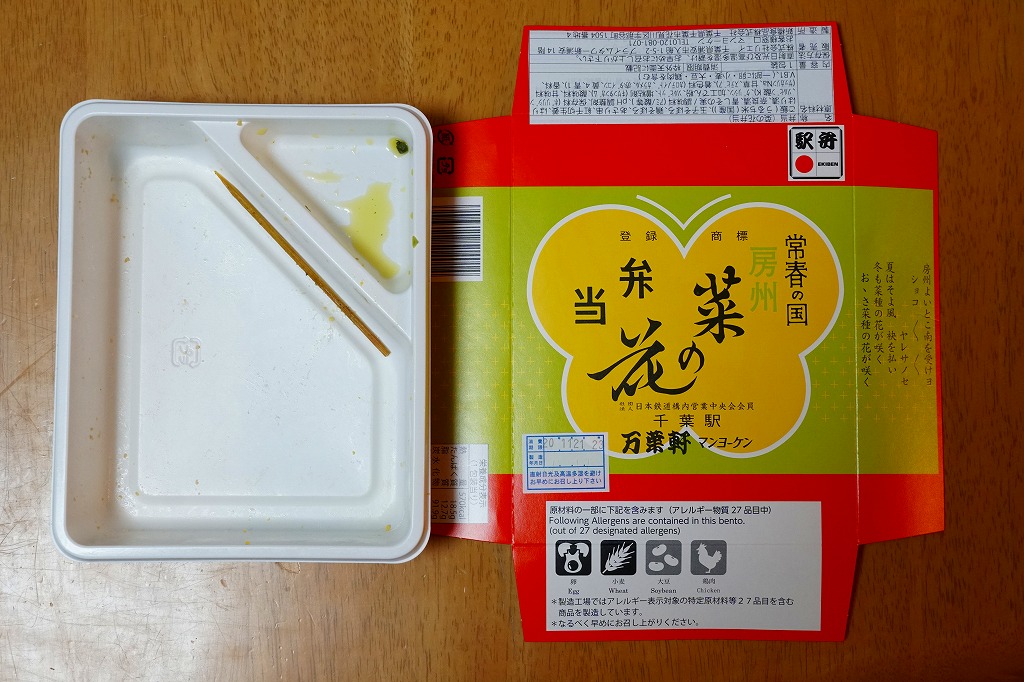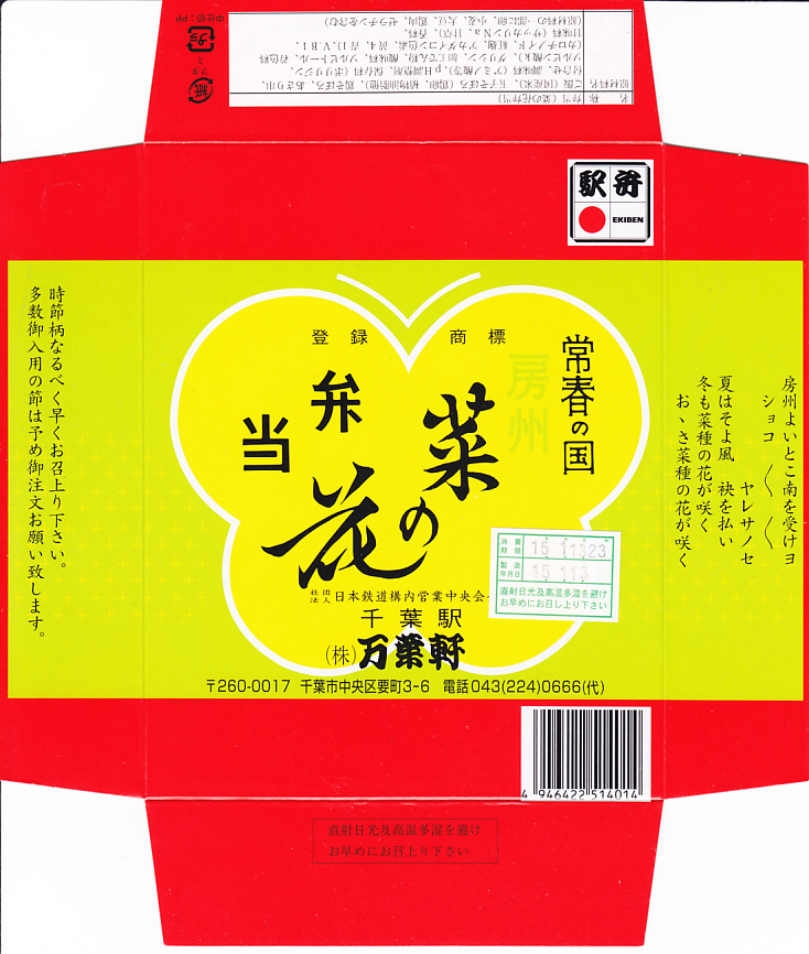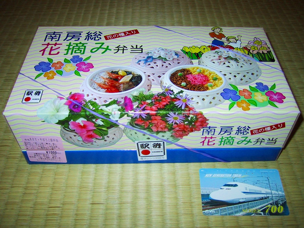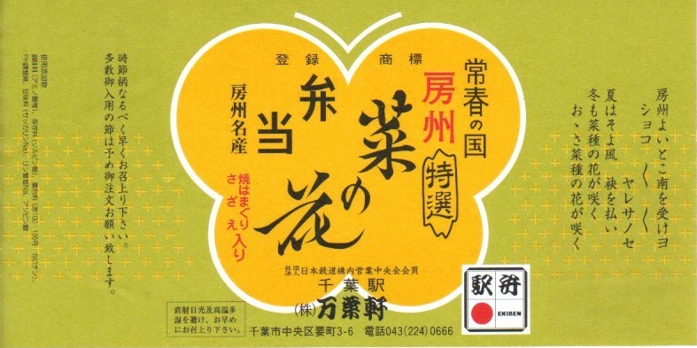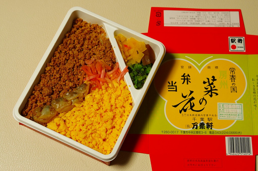 1966(昭和41)年の発売。とても小さな長方形の容器の中に白飯が敷かれ、その上に菜の花畑を卵そぼろで、畑の土を鶏そぼろで表現。仕切りにハマグリの串焼きを1本配置するのは蝶々なのだそうで、ふたの絵柄にもそれが見られる。房総の春をイメージするが、春に限らず通年の販売。価格は2001年の購入時で490円、後に520円、2007年12月から550円、2015年時点で600円、2015年7月から650円、2020年7月15日から700円、2022年4月16日から750円、2023年1月から800円、6月16日から880円、2025年2月20日から940円。10月から「消費者物価指数に連動した「時価販売」」として、3か月ごとに価格を見直すといい、まずは971円で販売。