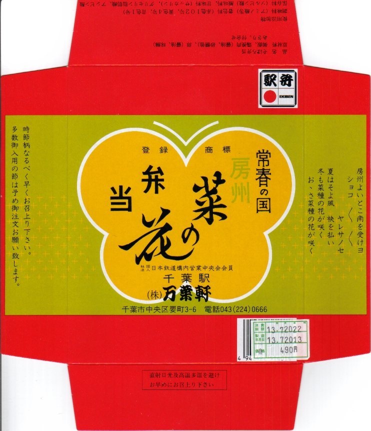 2015(平成27)年1月13日に購入した、千葉駅弁のふた。この絵柄や雰囲気に中身は、昔も今も変わらない。当時は「万葉軒」が、ブランド名や屋号でなく、駅弁屋の会社名であった。