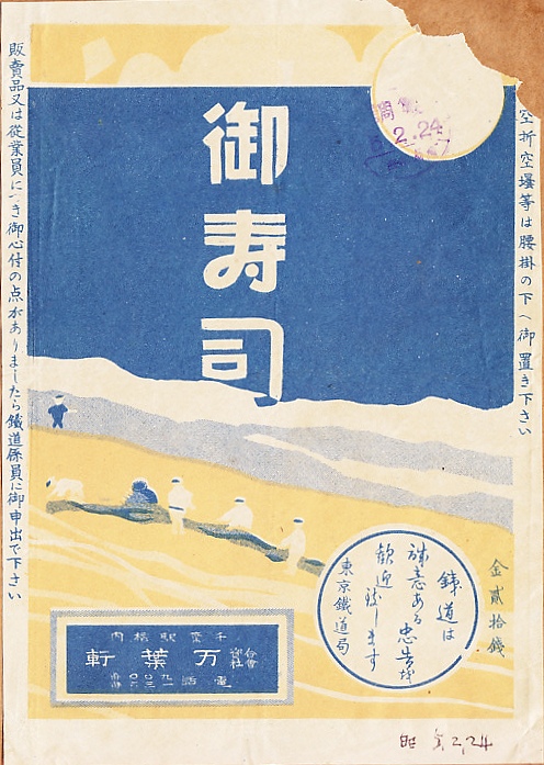 1930(昭和5)年2月24日の調製と思われる、昔の千葉駅弁の掛紙。収集者が掛紙の下部に年月日を書き入れた。東京湾でのノリ漁の光景でも描いたのだろうか。