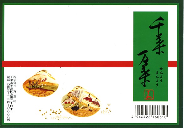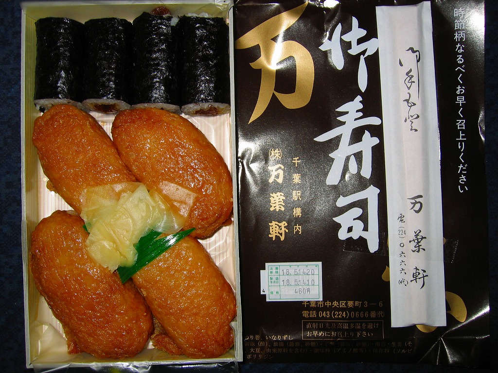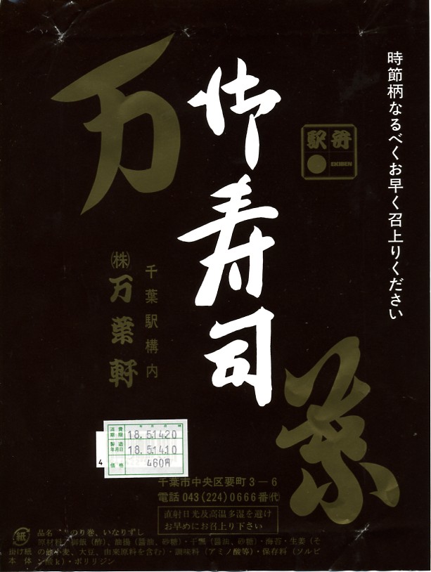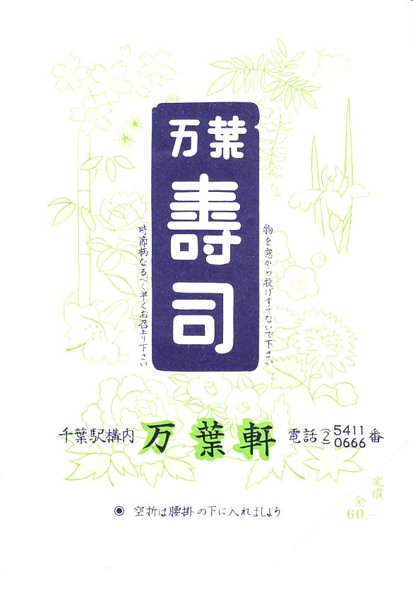 1960年代のものと思われる、昔の千葉駅弁の掛紙。復刻版として現存する万葉寿司、つまり助六寿司の掛紙だろう。千葉の十倍で万葉軒だから万葉寿司。今の介護会社のものになる前の万葉軒の駅弁紹介では、社名や駅弁の由来を万葉集でないとしていた。