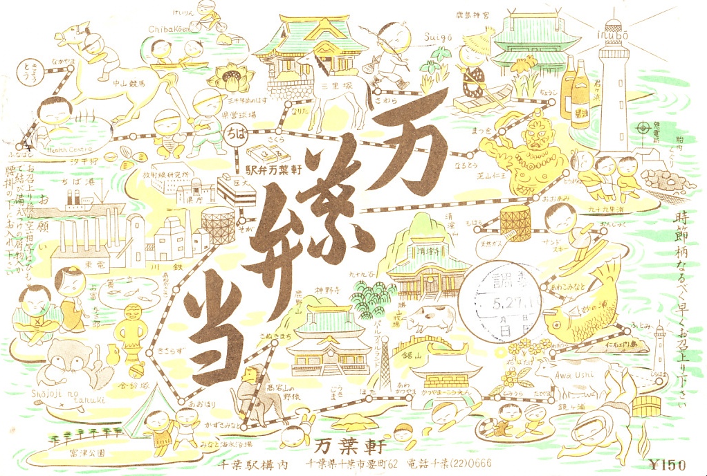 1960年代後半、昭和40年代の、5月27日10時の調製と思われる、昔の千葉駅弁の掛紙。千葉の十倍で万葉軒だから万葉弁当とした、幕の内駅弁の掛紙。千葉県内の名所を賑やかに描いた。この絵柄はのちに復刻されている。
