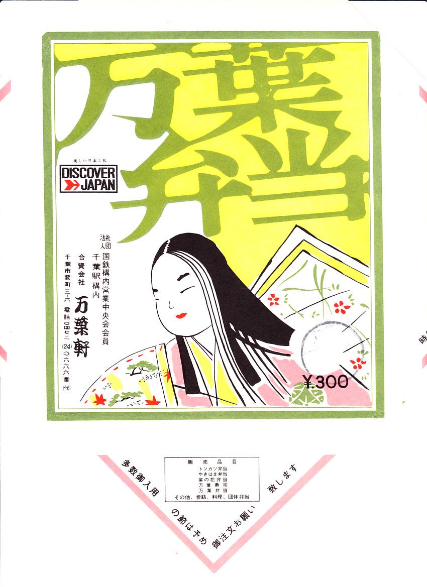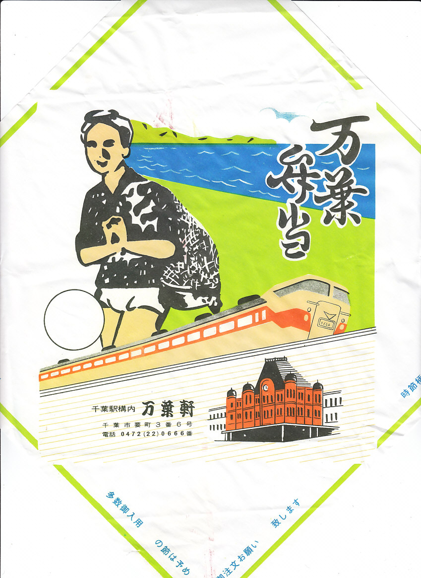 2024(令和6)年1月10日に購入した、千葉駅弁の掛紙。京王百貨店の駅弁大会で、掛紙を復刻した駅弁「昭和レトロな掛け紙弁当」のひとつとして、普段の千葉駅弁「万葉弁当」に掛紙をかけて輸送販売した。この絵柄の掛紙は、1965年頃の市内局番2桁化以降、1978年の成田空港開港以前のものか。容器と中身と値段も、普段の万葉弁当と同じ。