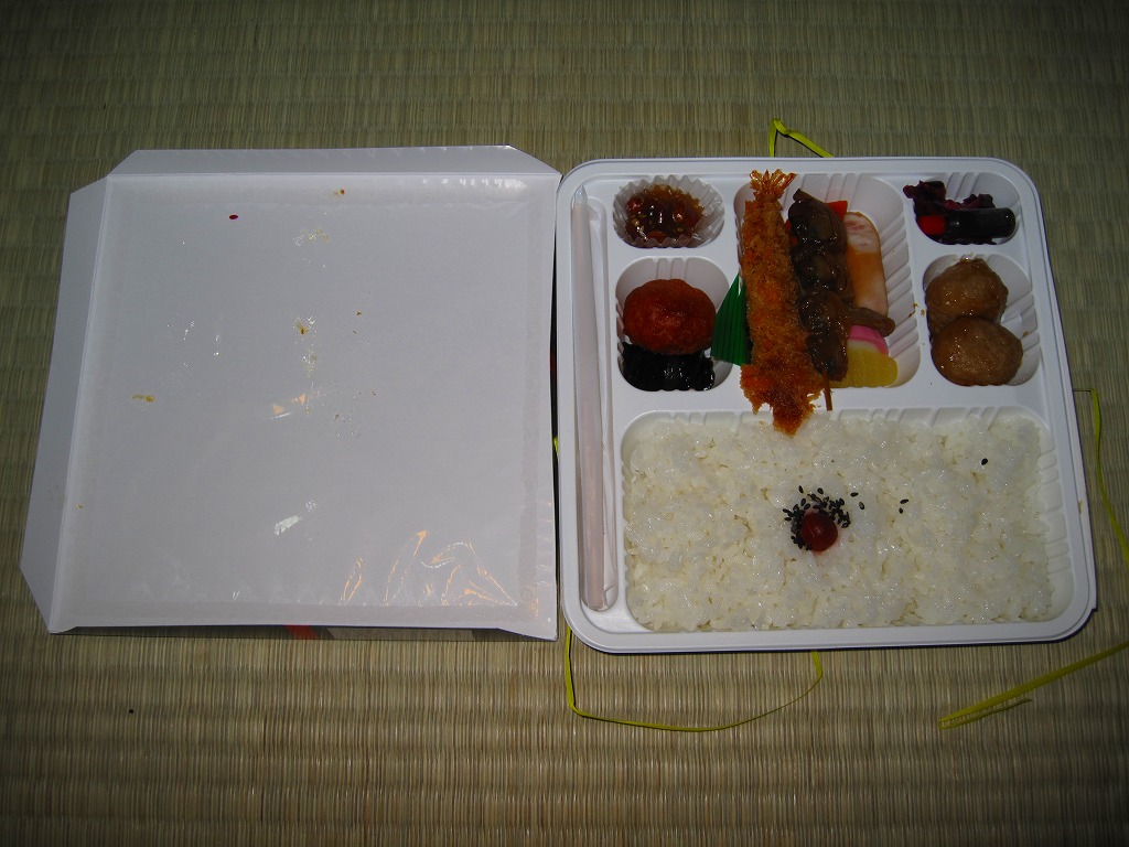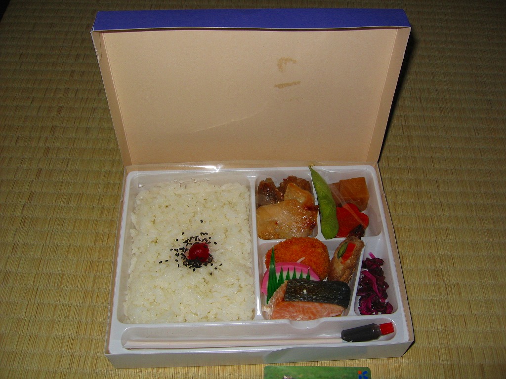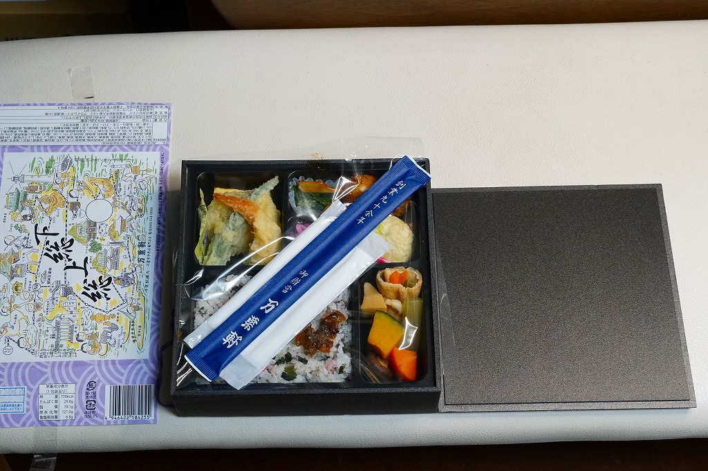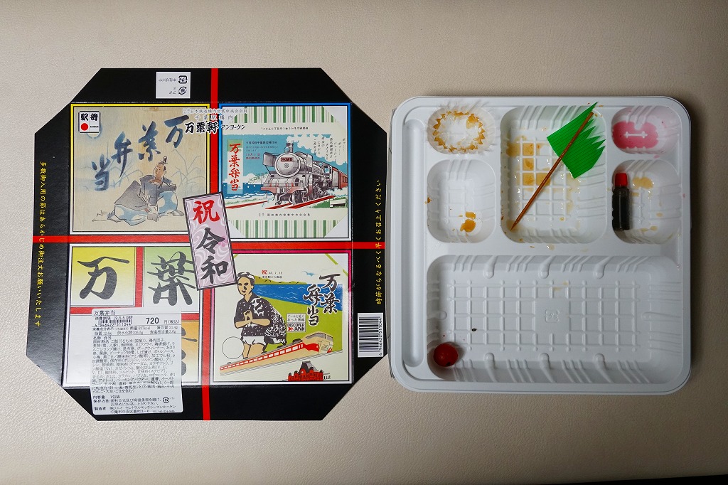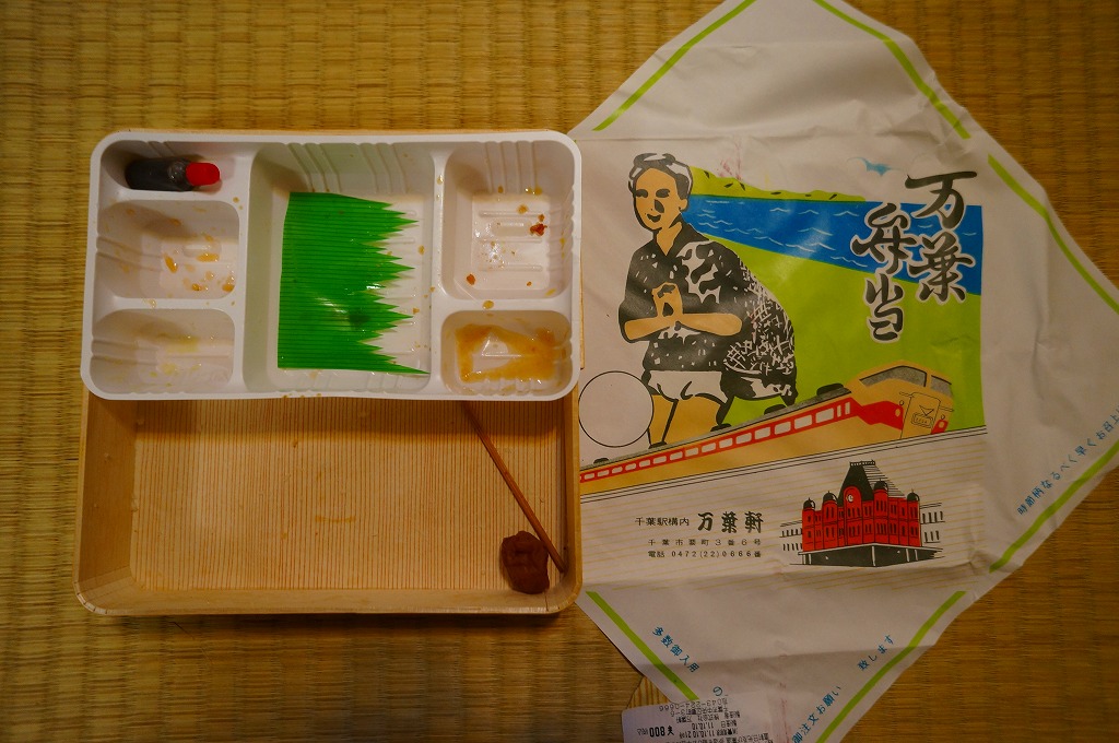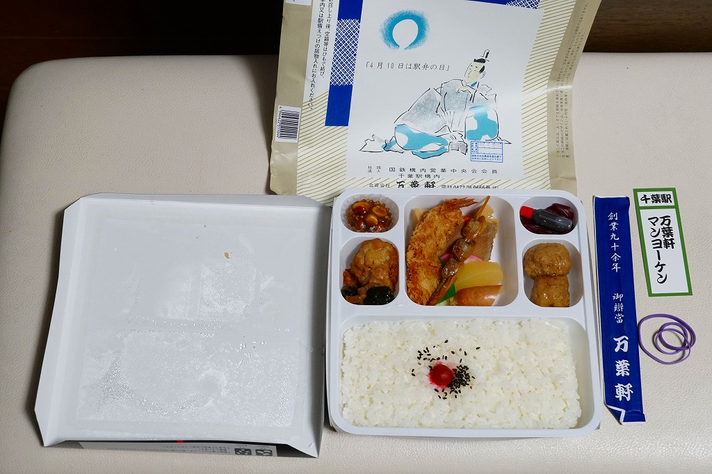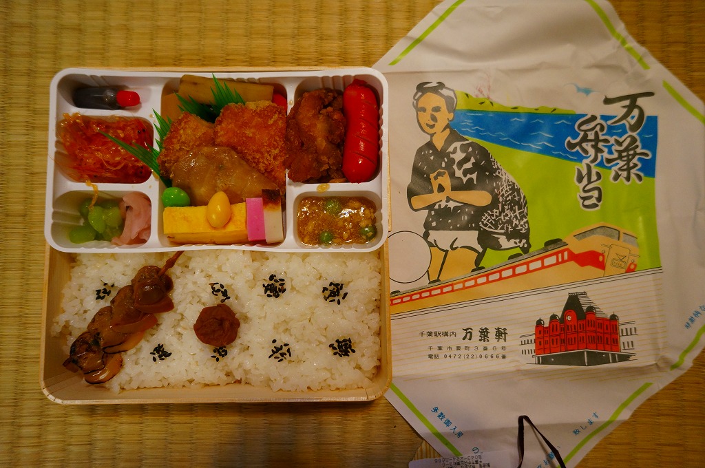正方形の平たい経木枠の容器を、千葉の海岸と特急「さざなみ」と東京駅を描いたのではないかと思う掛紙で包む。中身は日の丸御飯にハマグリ串焼きを置き、サワラ照焼、紅白のかまぼこ、玉子焼、アジフライ、鶏唐揚、ウインナー、とりそぼろあんかけ、タケノコやニンジンなどの煮物、切りイカなどの佃煮その他を詰めたもの。掛紙のイラストが不思議ちゃんで、おかずの内容が昔風。今出しても売れないだろうが、時々は食べてみたい味。