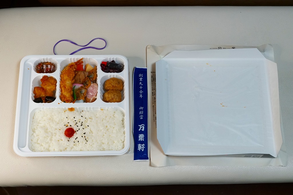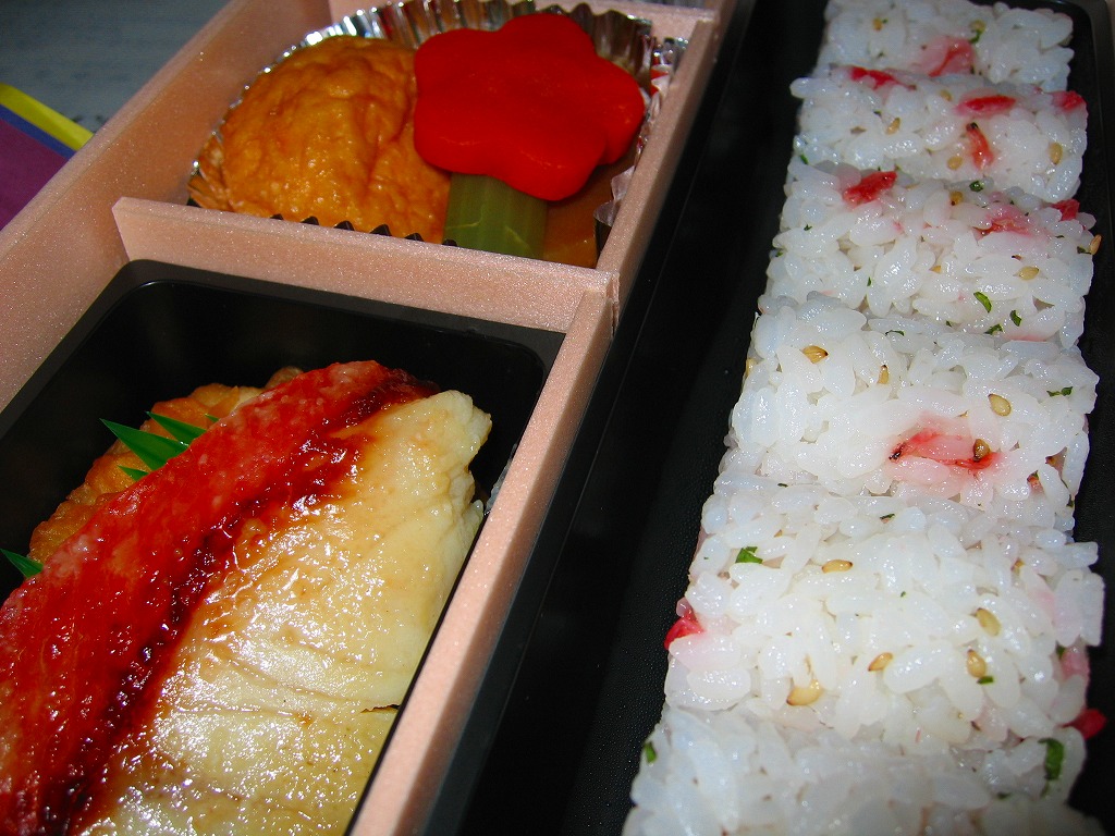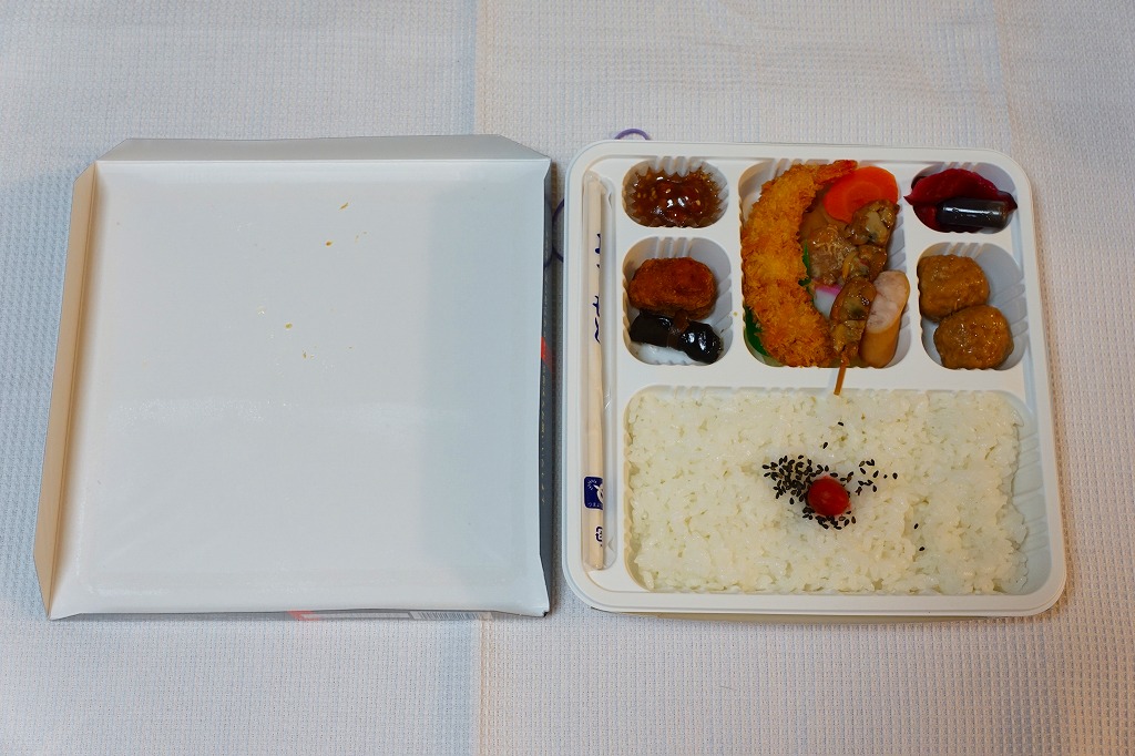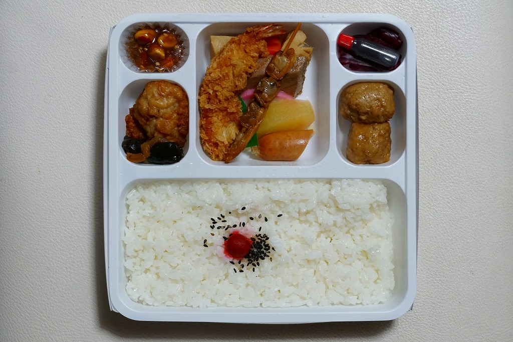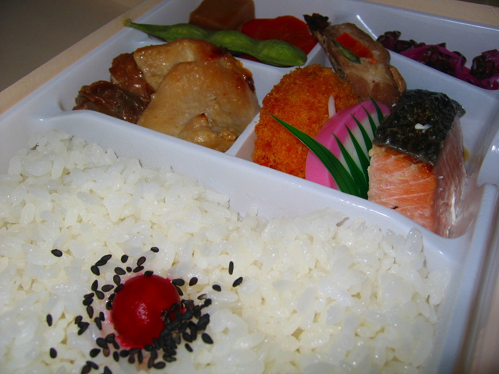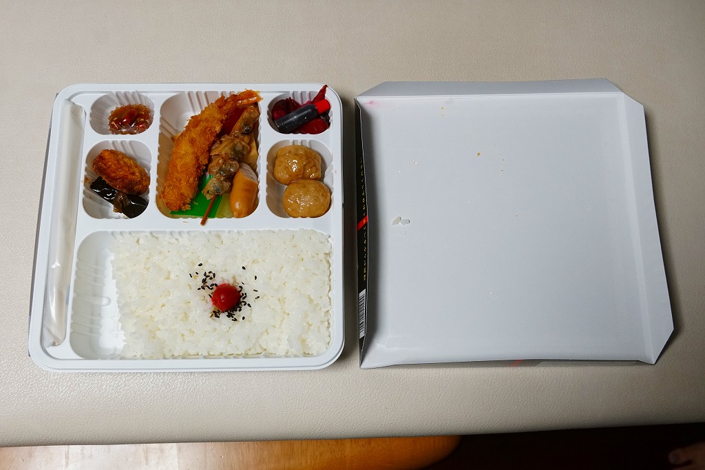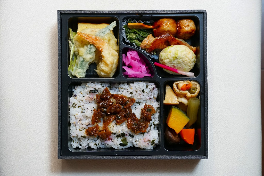正方形の平たい経木枠の容器を、千葉の海岸と特急「さざなみ」と東京駅を描いたのではないかと思う掛紙で包む。中身は日の丸御飯にハマグリ串焼きを置き、サワラ照焼、紅白のかまぼこ、玉子焼、アジフライ、鶏唐揚、ウインナー、とりそぼろあんかけ、タケノコやニンジンなどの煮物、切りイカなどの佃煮その他を詰めたもの。掛紙のイラストが不思議ちゃんで、おかずの内容が昔風。今出しても売れないだろうが、時々は食べてみたい味。