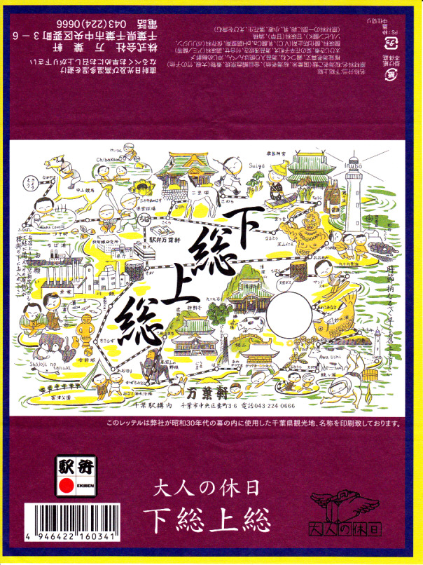 珍しく1業者で2種類も出す、千葉駅版の「大人の休日」駅弁のひとつ。木目調で柔らかな長方形の容器に、下総(しもうさ)と上総(かずさ)つまり現在の千葉県をほぼサポートするエリアの名所名物を隙間なく描いた、昭和30年代の幕の内弁当の掛紙の絵柄を載せた掛紙をかける。