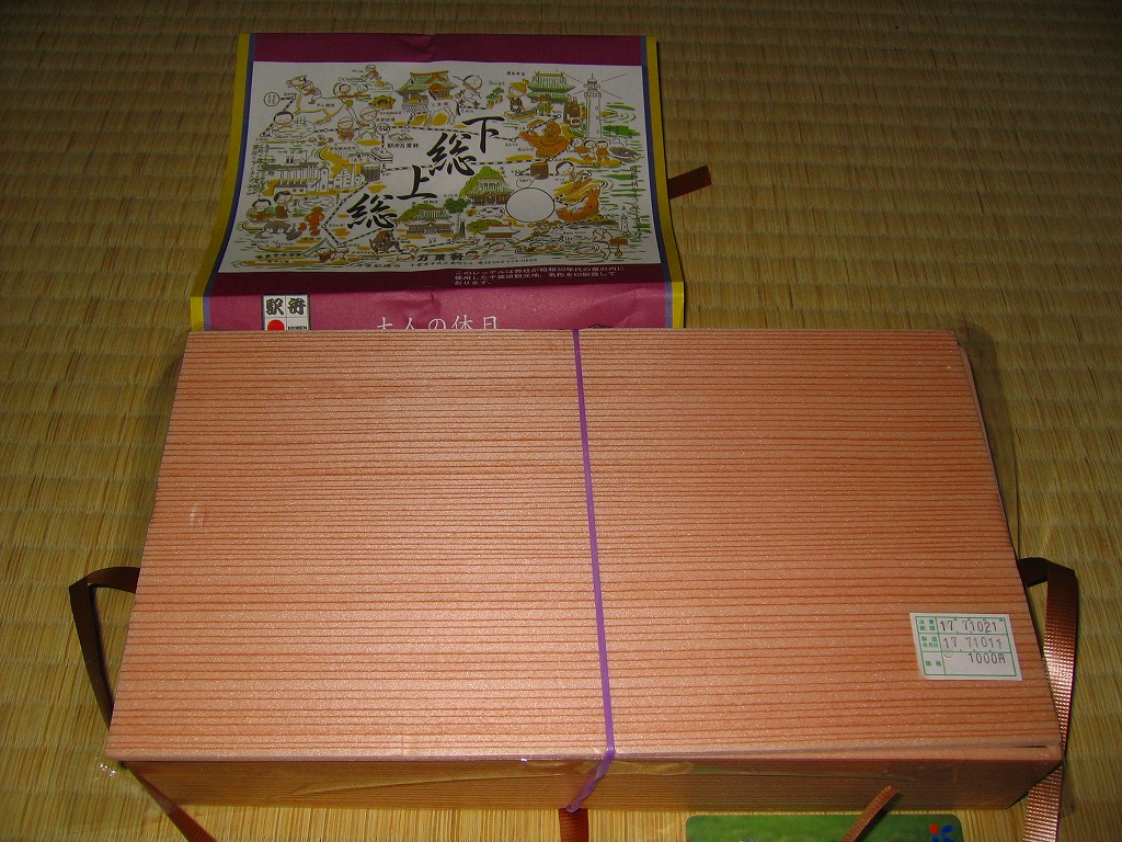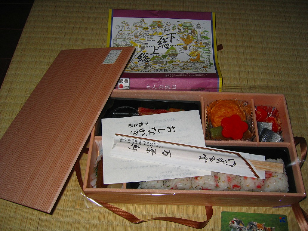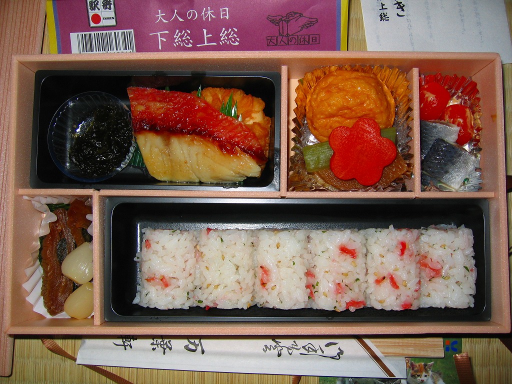 中身は桜海老の型押し俵飯に、鯛の佐倉味噌焼、マグロの竜田揚、落花生田楽、イワシの酢締めなど、下総上総をイメージした食材を詰める。大人の休日のコンセプトに従い、見た目も風味も千葉駅弁らしからぬ高級感が演じられる。予約制駅弁と案内されるが、現地に行けばけっこう置いてあるらしい。価格は2005年の購入時や下記の2013年時点で1,000円、2015年時点で1,100円。2015年頃までの販売か。