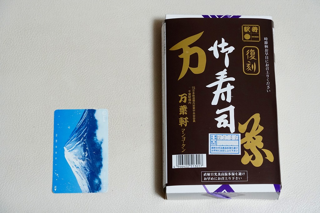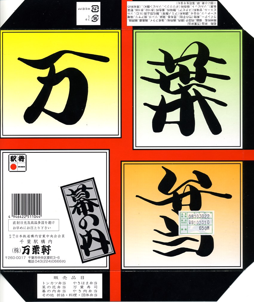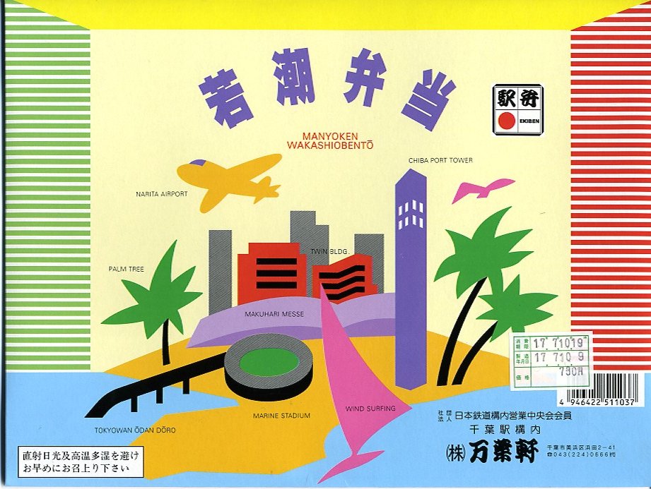 2024(令和6)年5月5日に購入した、千葉駅弁の掛紙とふた。同年4月1日から23日まで千葉駅で販売。駅弁の日に合わせ、日本鉄道構内営業中央会の会員のうち31社が各社おすすめ駅弁に共通ノベルティ「千社札風カード」を添付して期間限定で販売した駅弁の、千葉駅バージョン。いつも売られる「万葉弁当」そのものに、昭和時代の絵柄を取り入れた掛紙をかけて販売した。だから容器と中身と風味と価格は変わらない。
