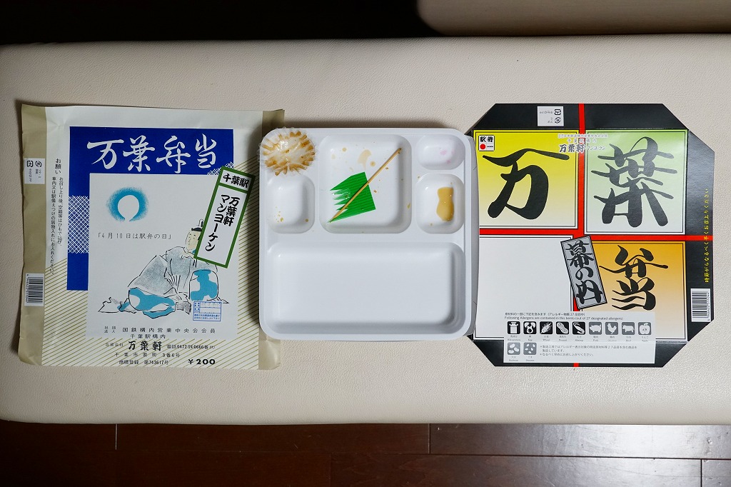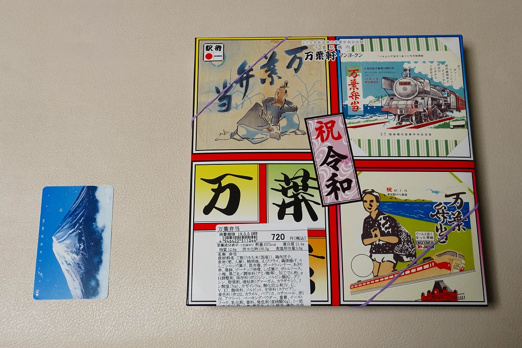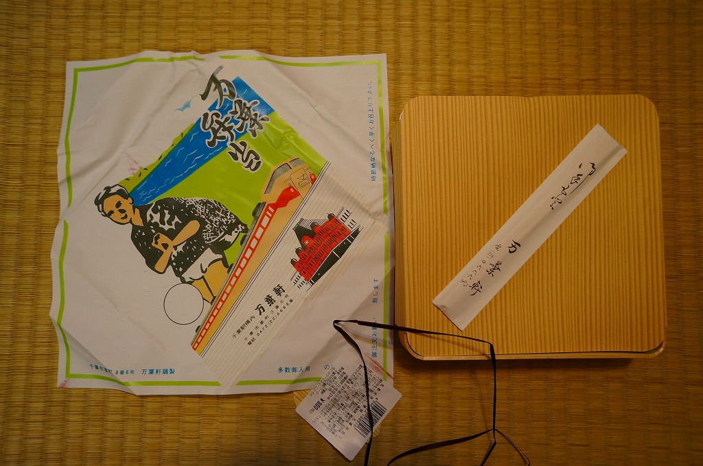 2011(平成23)年10月8日から10日までに東京駅で開催された「第14回東日本縦断駅弁大会」で販売されたお弁当で、過去の千葉駅弁を復刻したものだという。万葉弁当は上記のとおり現役の駅弁なので、40年前くらいの掛紙と内容を再現したのだろうか。