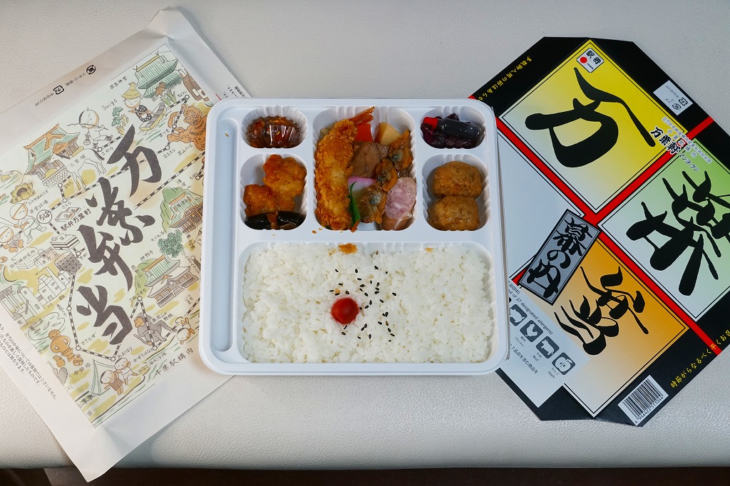 千葉駅で定番だという幕の内駅弁。正方形の白いプラ製トレーをそのまま使い、商品名や調製元を書いたボール紙でふたをして、ひもで十字にしばる。中身は日の丸御飯に肉団子、エビフライ、鶏唐揚、マグロ照焼、ウインナー、タケノコなどの煮物、昆布巻、かまぼこ、焼アサリ串、リンゴ、味噌ピーナッツ、柴漬け。