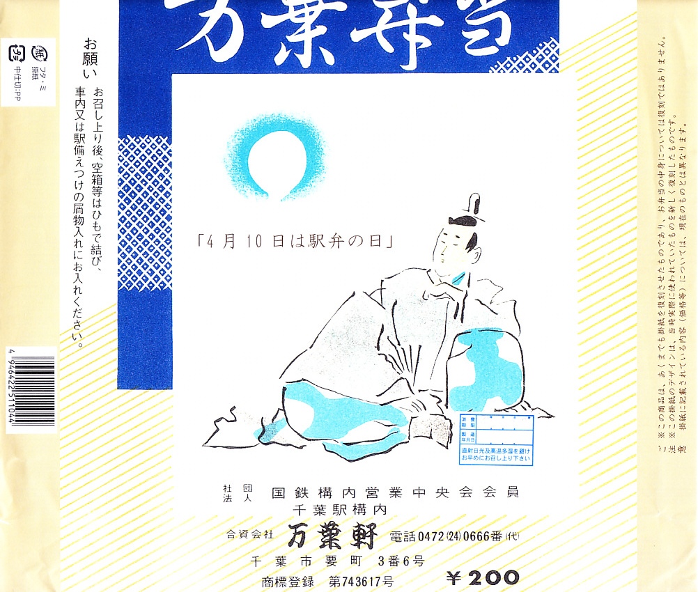 1970年代のものと思われる、昔の千葉駅弁の掛紙。200円の価格から、1972年までのものか。この殿様はいったい誰なのか。この万葉弁当は当時も現在も幕の内弁当であるが、1970年代の資料では普通弁当でなく特殊弁当の分類で紹介されている。