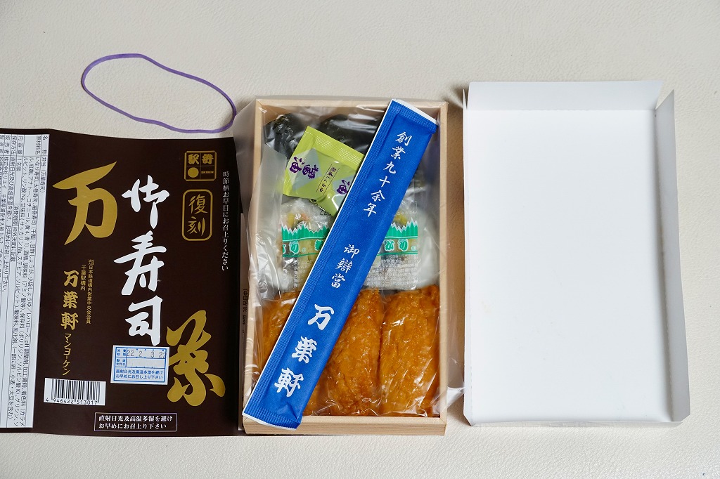 2020(令和2)年10月26日に発売。古くは「御寿司」の名で売られた助六寿司の普通弁当で、平成時代に万葉御寿司と改称、2014年9月に「惜しまれつつ終売となった」(調製元フェイスブック)ものを再販した。2021(令和3)年10月のJR東日本の駅弁キャンペーン「駅弁味の陣2021」に、新作駅弁としてエントリー。