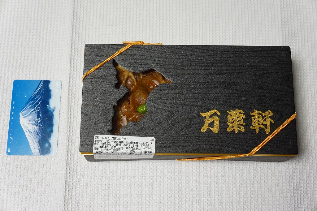 JR東日本の駅弁キャンペーン「駅弁味の陣2017」にエントリーするために、同期間中の2017(平成29)年10月から11月までの販売か。エントリー名は「千葉元気豚めし」で、食品表示ラベルでの商品名は「元気豚めし弁当」。「万葉軒」とだけ記した、千葉県の地図をくりぬいた黒い容器を使う。