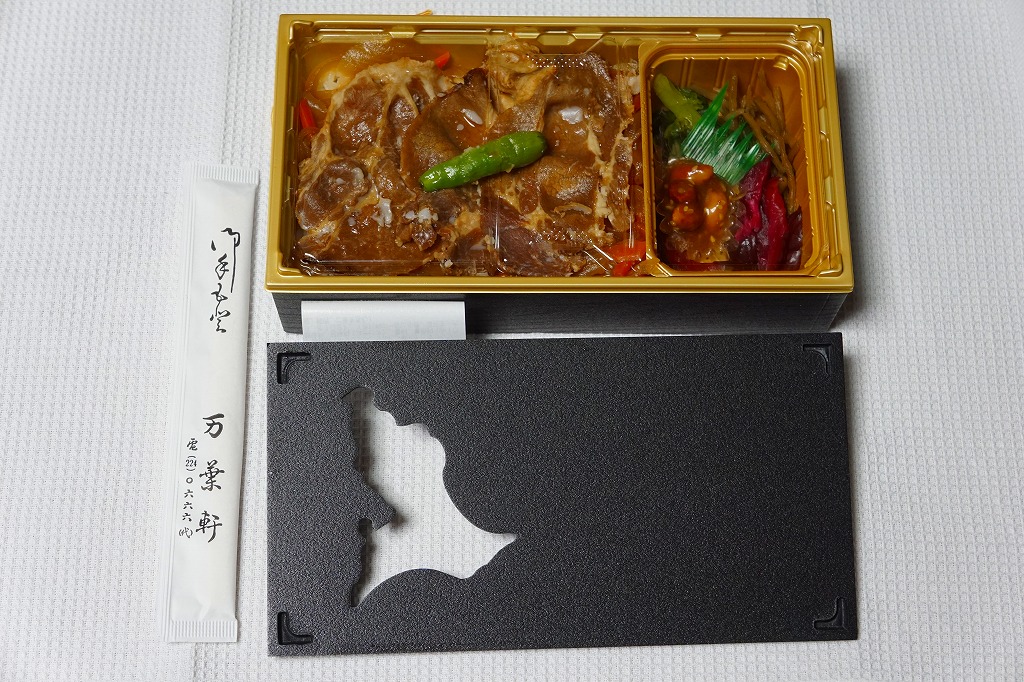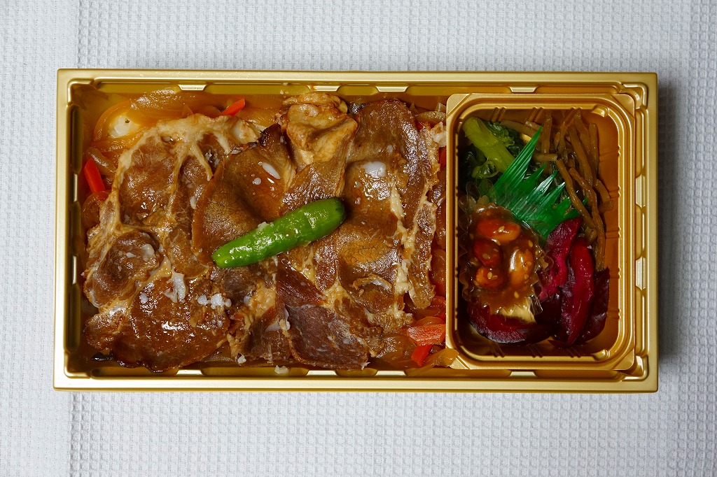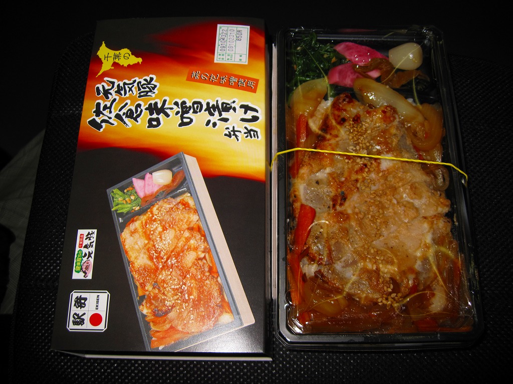 2009(平成21)年9月に発売か。黒いトレーを接着した長方形の容器に透明なふたをして、輪ゴムで留めてから中身の写真を印刷したボール紙の枠にはめる。中身は白御飯の上にタマネギとニンジンの炒め物を敷き、豚ロース肉の味噌漬け焼きを1枚のっそり載せて、ほうれん草のピーナツ和え、鉄砲漬、赤かぶ漬、ラッキョウを添えるもの。中身が常温でも、パッケージの絵柄も含めて熱さを感じる駅弁。価格は2009年の購入時で850円、2015年時点で880円、2015年7月から900円。2020年の春頃に、ひっそりと終売か。