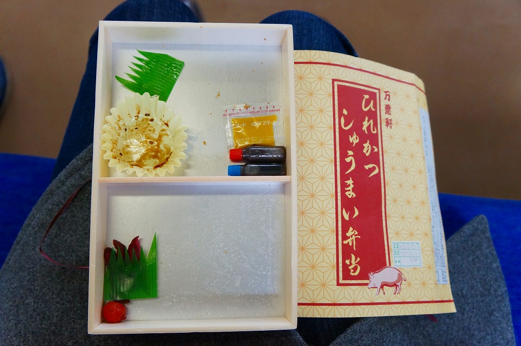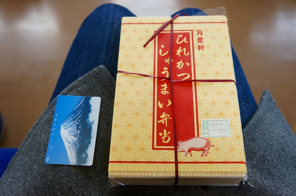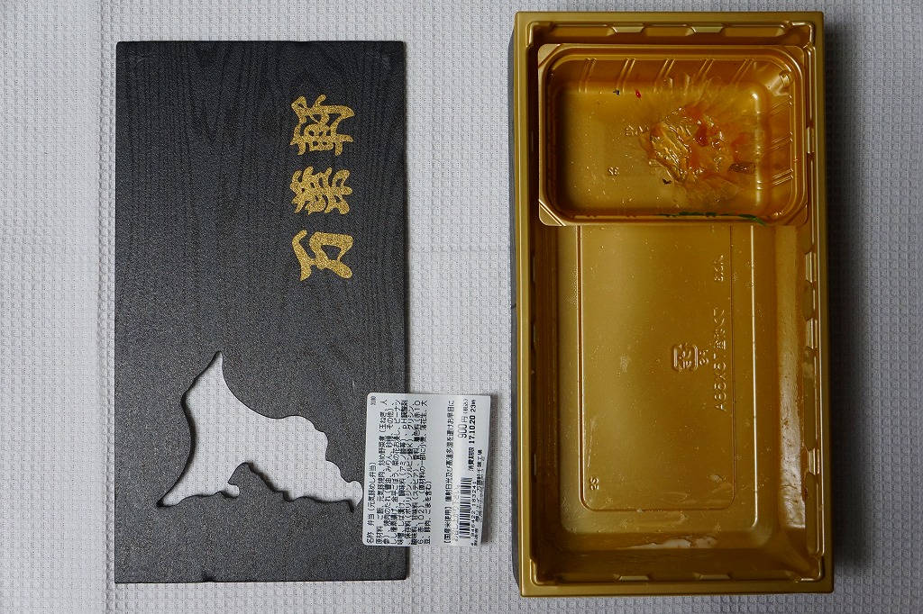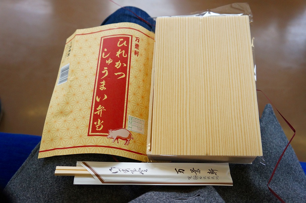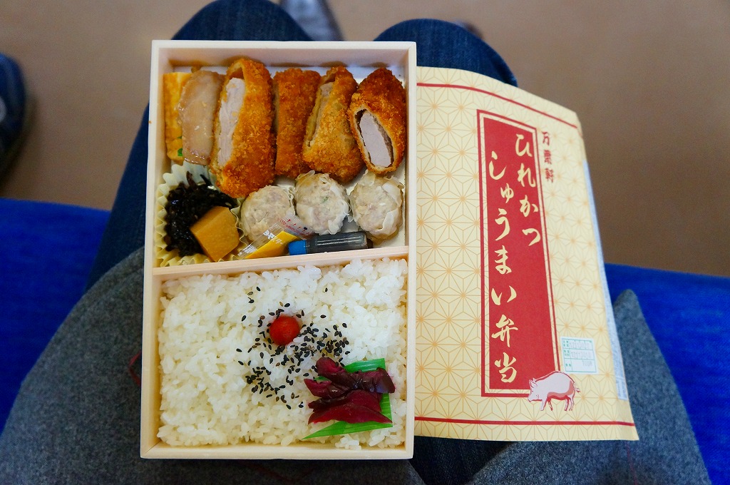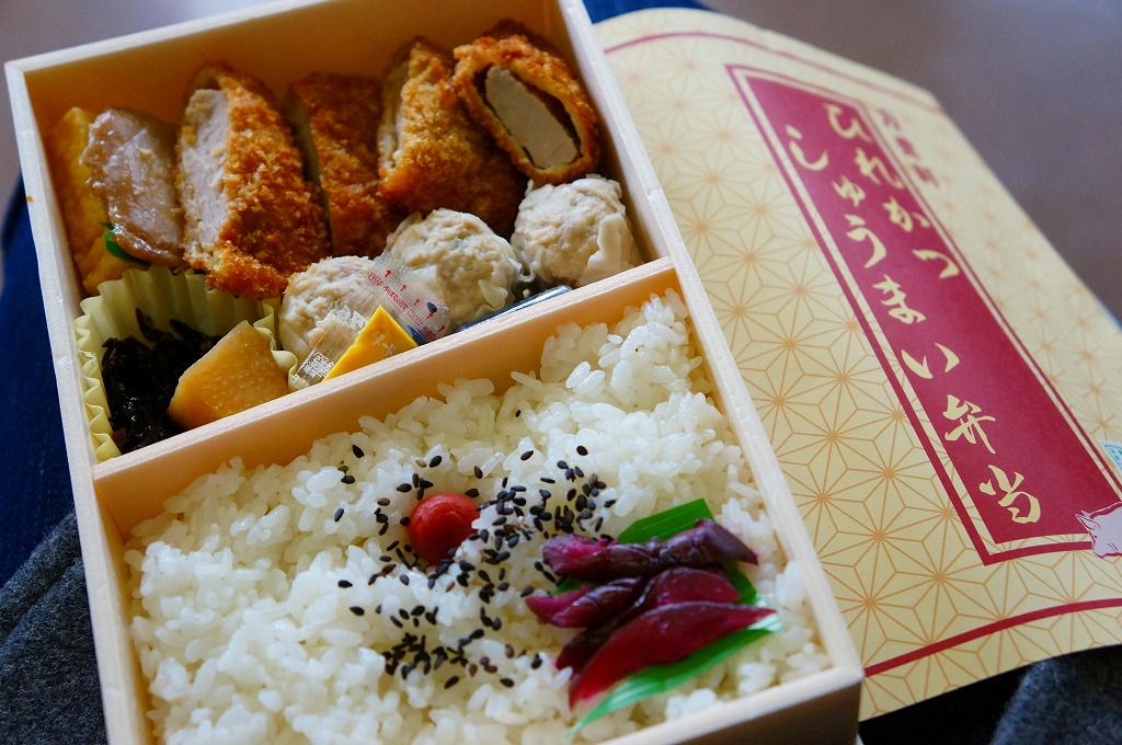 2012(平成24)年10月の発売。そんな新作であることを感じさせない、古めに落ち着いたデザインの掛紙に包まれた長方形の容器の中身もまた、日の丸御飯としば漬け、ヒレカツ4切れ、しゅうまい3個、マグロ照焼、玉子焼、タケノコ角切り、ひじき、辛子、醤油という具合に落ち着いている。