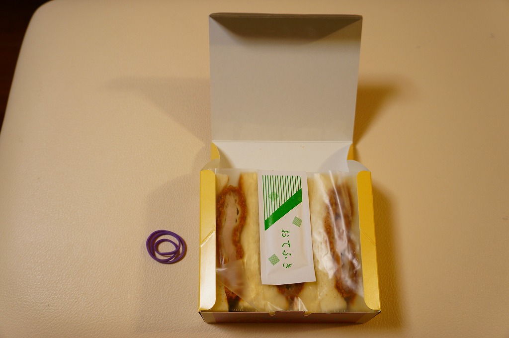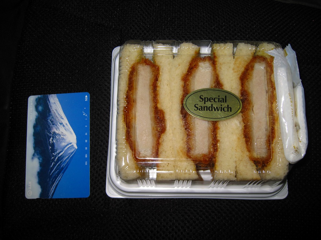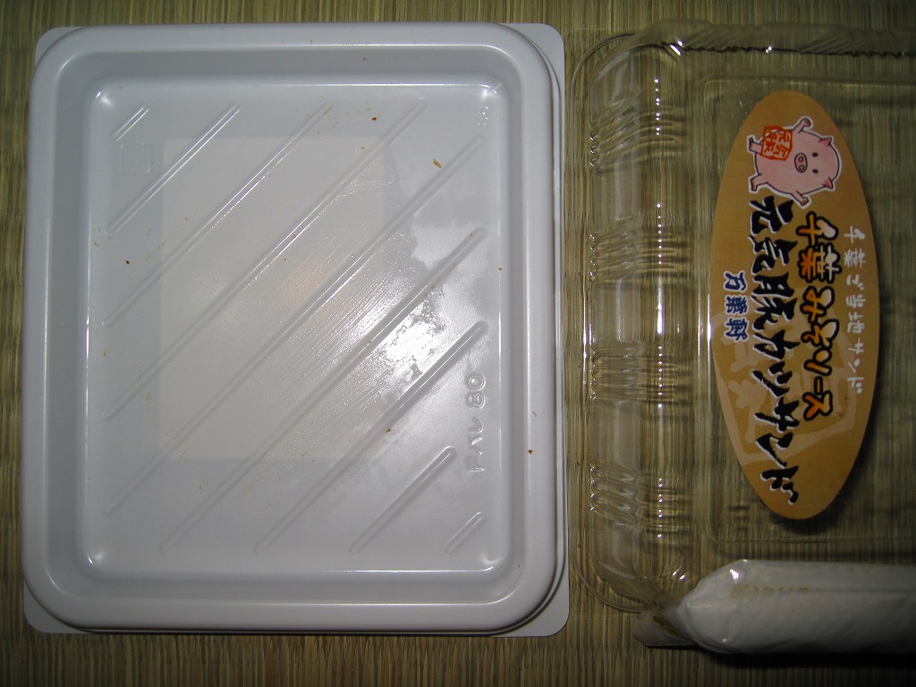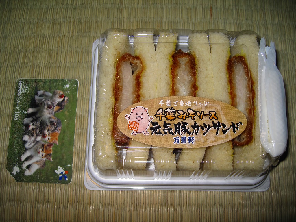 2009(平成21)年8月に発売か。駅弁屋が千葉のご当地サンドを開発したものだそうな。B級グルメの下を行くトンカツ弁当のカツと異なり、現代的かつ都会的な食感を持つカツがサンドイッチになり、プラ製ケースに3切れ収まる。この「千葉みそソース」版の他に「落花生ソース」版がある模様。2013年頃までの販売か。