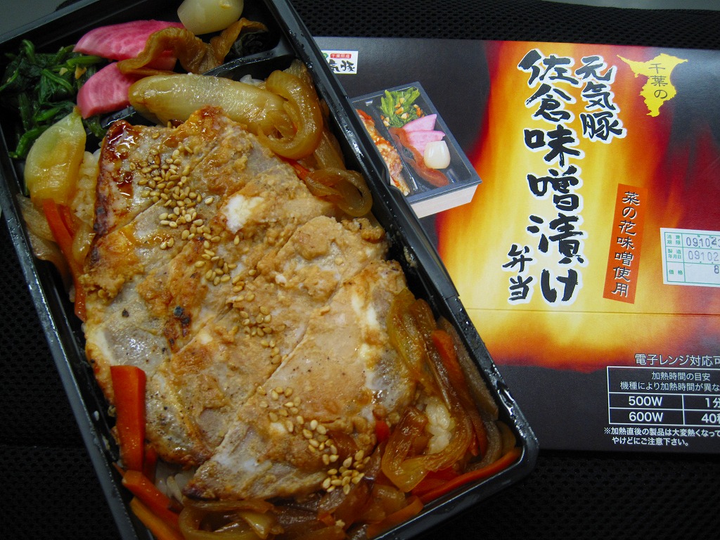 2009(平成21)年4月1日に発売。内容は名前のとおり、長方形のプラ製容器に白御飯を詰め、その上に千葉県産「元気豚」の味噌焼を貼り、タマネギソテー、きんぽらごぼう、豚味噌、柴漬けを添え、透明なふたをかけて、熱いデザインの掛紙で巻き、黄色いひもでしばっている。