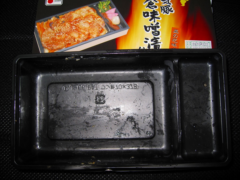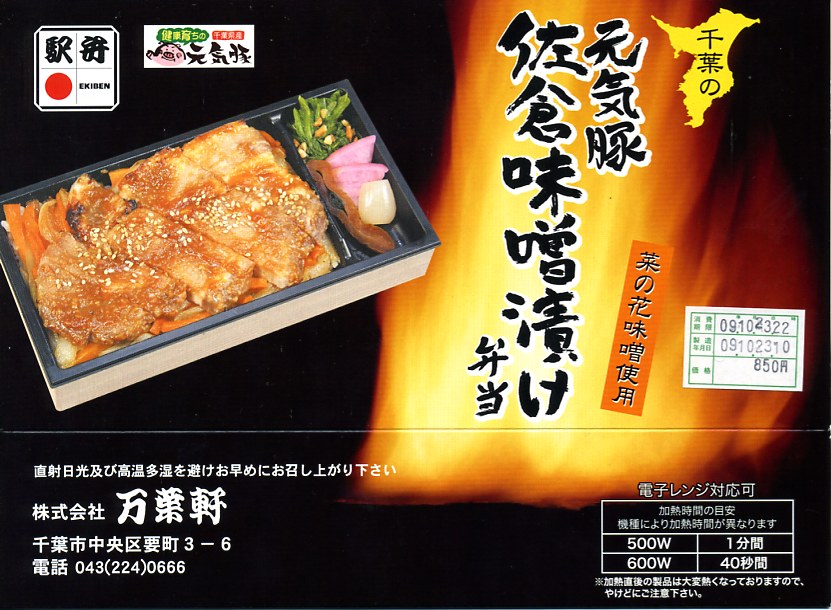 食べればB級グルメ感が満点の豚味噌焼弁当で、中身も掛紙も燃えるようなパワーがみなぎる印象。650円の駅弁なのに本格的な豚焼肉重、しかし豚肉に白く脂が浮いていて、千葉駅弁らしいチープさが出ている。掛紙記載「レンジアップで一層美味しく」のとおり、駅弁売店ではレンジでの加熱を推奨しているそうで、そうすると容器が溶けてしまうのではと思うが、見栄えと味からチープさが消えてくれそう。1年程度の販売で終売か。