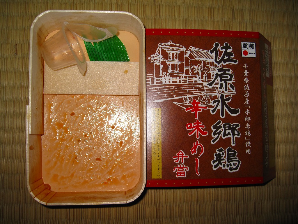 秋冬の駅弁大会シーズンに向けた、2010(平成22)年秋の新商品。手のひらサイズの経木枠の容器を、商品名と佐原の建物を描いたボール紙の枠にはめる。中身は鶏ガラスープの炊込飯の上に粒の大きい千葉県佐原市のブランド鶏「水郷赤鶏」の鶏そぼろを敷き、同じくその鶏照焼を3切れ並べてタレをかけ、がんもどき、こんにゃく、サツマイモ茎佃煮、梨葛ゼリーを添えるもの。別添のオリジナルラー油をかけて食べることを推奨する、2010年に流行した「食べるラー油」の要素を取り入れた、濃厚濃縮な鶏そぼろ照焼丼。コンパクトなのに下げ底で分量も重量もある。このシーズンのみの販売だった模様。