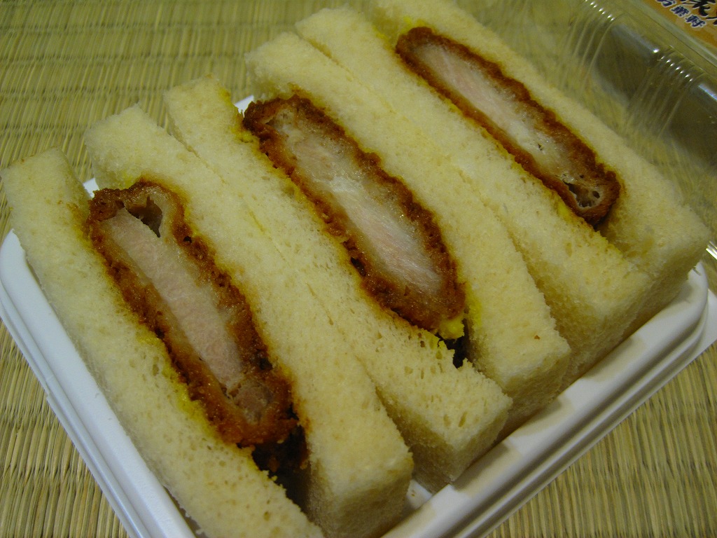 千葉駅の駅弁売店で駅弁とともに販売していた、駅売りのカツサンド。写真のとおり、ソースに漬けたロースカツを、辛子マヨネーズを塗った食パンに挟んでカットした、シンプルな普通のカツサンド。マヨネーズの効果で、油っぽいけれどトゲのない味になっていた。千葉駅弁には大変に珍しく、食品表示ラベルに製造委託の記号が付いている。「県産豚カツサンド」の発売により終売か。