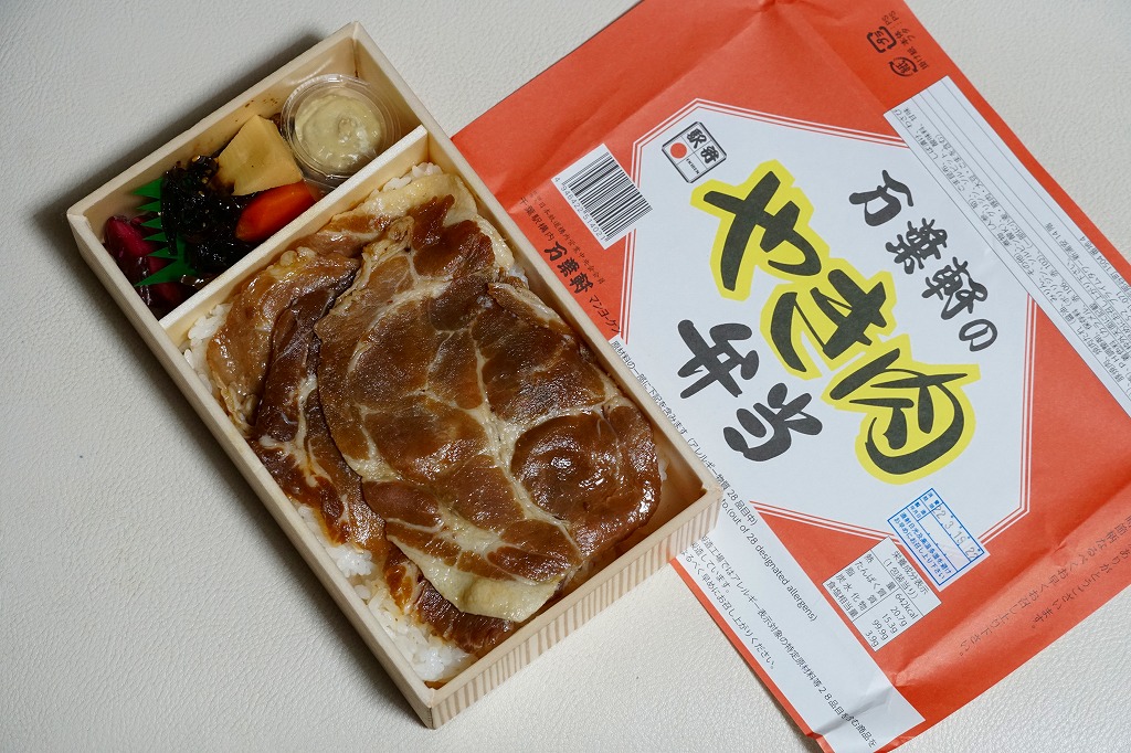 長方形の容器を、駅弁の名前を書いた赤い掛紙で包む。中身は白御飯に豚焼肉を貼り付け、煮物と漬物を添えるもの。構成は普通の肉駅弁でも、メインの肉が普通でない。甘いタレが浸みた赤黒い、薄くて赤身も筋も固い焼肉は、柔らかさや脂の乗りやうまさを競う市販の弁当や駅弁とは一線を画す。1990年代まで400円台で提供された格安の駅弁は、当時の通学生などに支持された。安さとチープさが個性で特徴だった異色の駅弁。