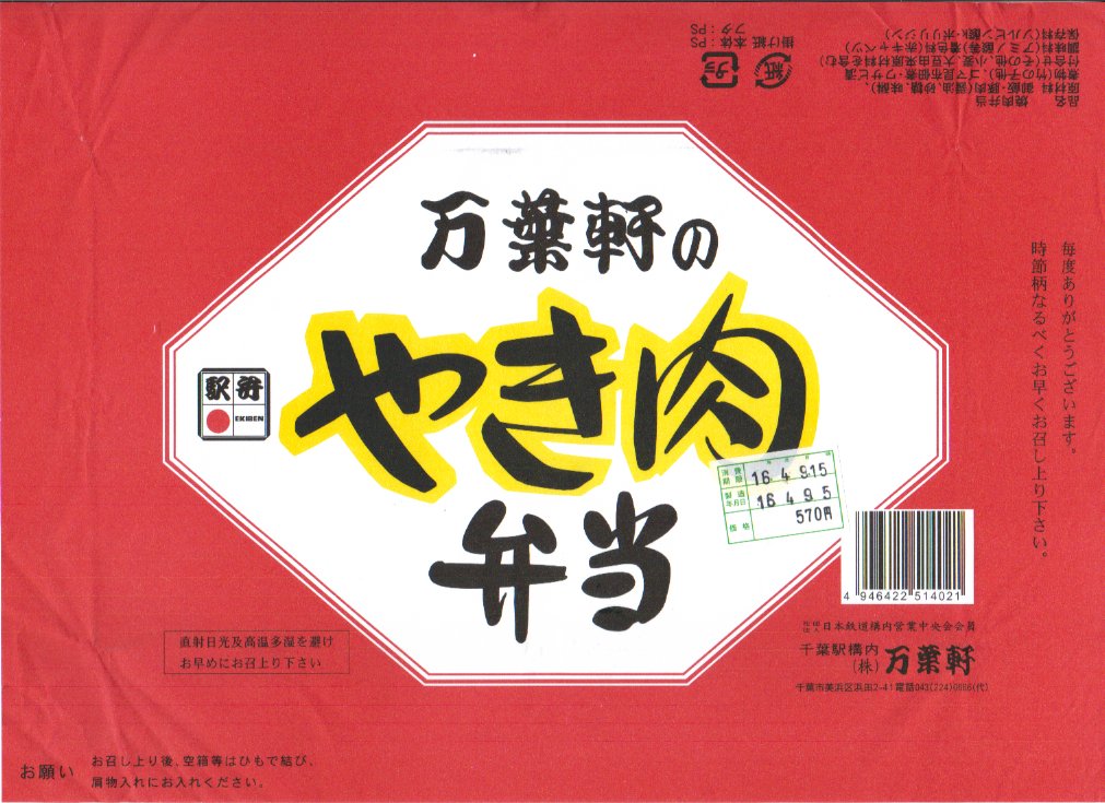 2004(平成16)年4月9日に購入した、千葉駅弁の掛紙。法定の表示の差異はあるが、この絵柄は長らく変わらない。中身も上記の2022年のものと、まったく同じ。