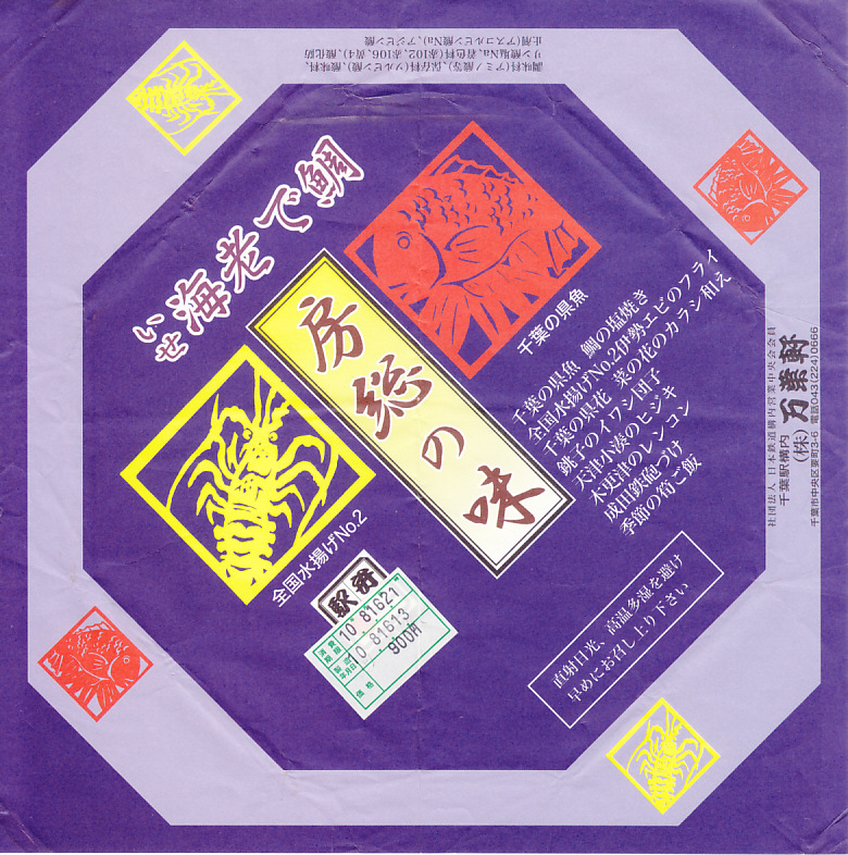 1998(平成10)年8月16日13時の調製と思われる、昔の千葉駅弁の掛紙。1998(平成10)年の、4月10日の駅弁の日に当時の千葉県内の駅弁業者5社が発売した駅弁で、掛紙は各社が共有した。佐倉駅と安房鴨川駅では早くに売り止め、木更津駅と成田駅では駅弁業者が撤退、この千葉駅のものが最後まで残った。