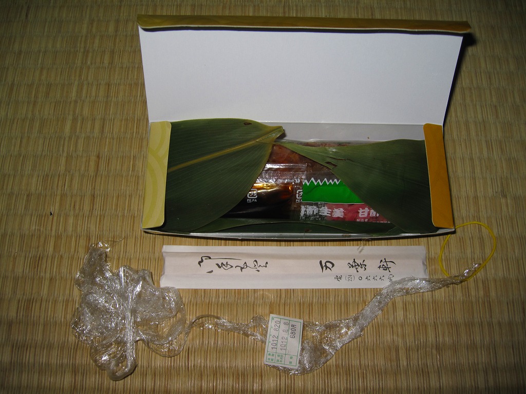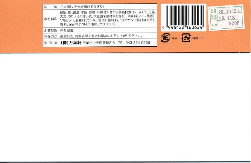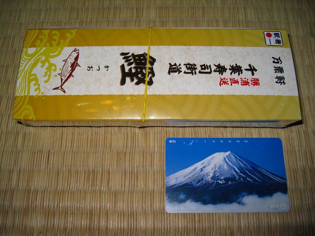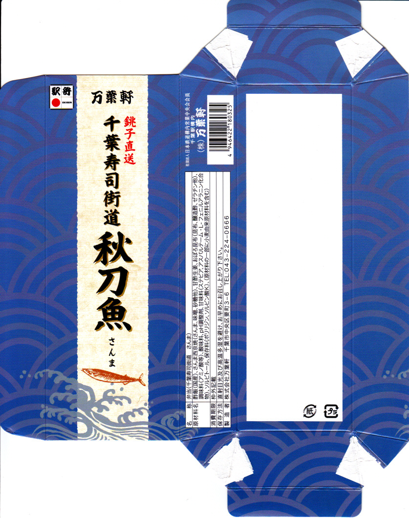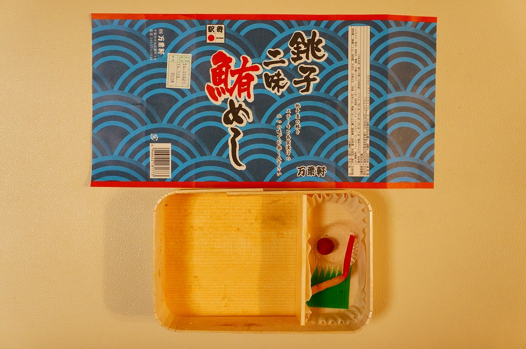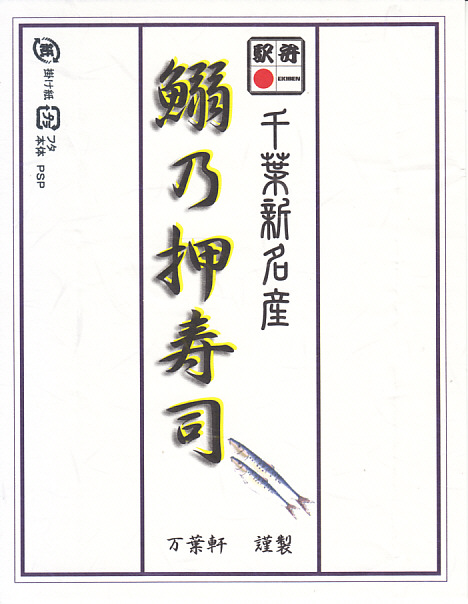 使われた時期がまったく分からない、昔の千葉駅弁の掛紙。上記の駅弁「鰯乃押寿司」の、2004年11月のものと同じ。リサイクル識別表示があるから2001年以降のものだろうが、調製印がない、食品表示もない、特徴的な絵柄もない、価格もないでは、もうお手上げ。