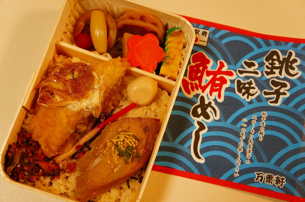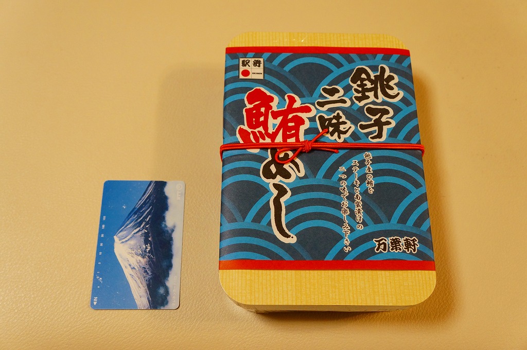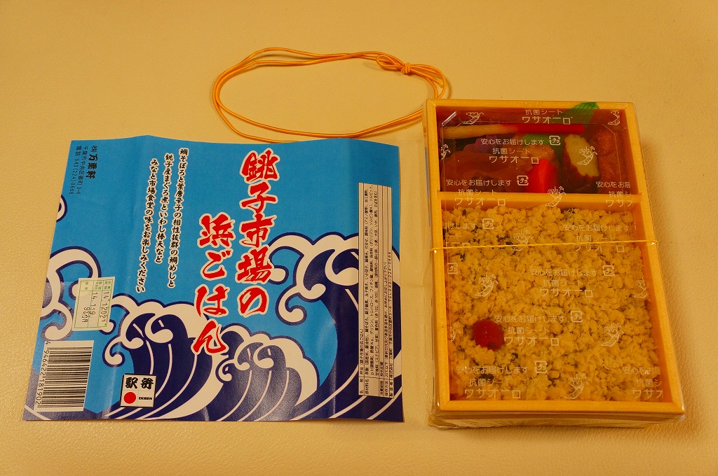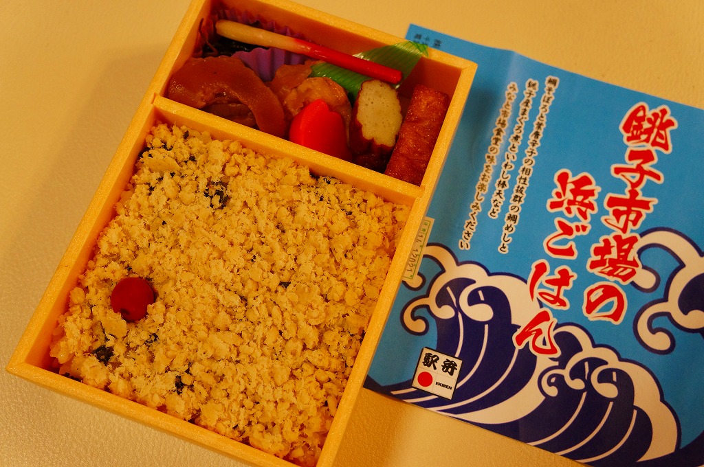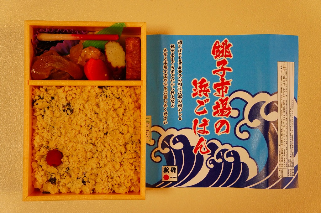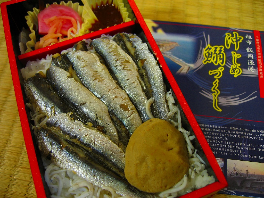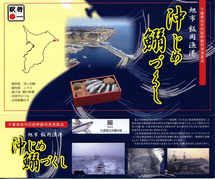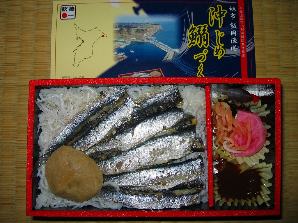 2008(平成20)年5月3日に発売。赤い長方形の容器を、飯岡漁港と千葉県の形と中身の写真をそれぞれ小さく載せたボール紙の枠にはめる。中身は白御飯の上にシラスを振り、千葉県旭市の飯岡漁港で水揚げしたというカタクチイワシの酢漬けをきれいに並べて貼り、いわしつみれを置いたうえで、鯛味噌やサツマイモ茎佃煮や赤カブ漬などを添える。添付の醤油はイワシの魚醤(ぎょしょう)。
