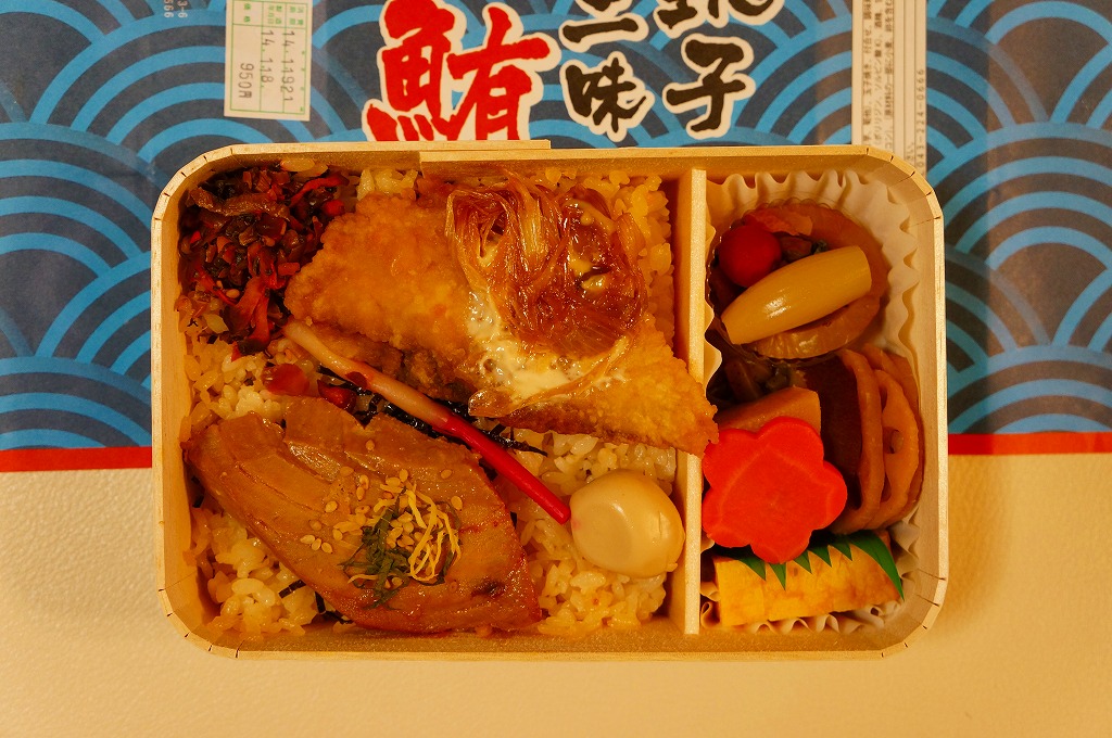 2013(平成25)年の春頃の発売か。中身はつまり鯛飯で、茶飯をタイのそぼろで覆い、マグロ煮、イワシ棒天、イカ団子、玉子焼などを添えるもの。容器が貧弱に柔らかかったり、飯がボロボロと食べにくかったり、つくりのチープさが気になったが、それでも一食として過不足ない具と量は備えていた。2016年までの販売か。
