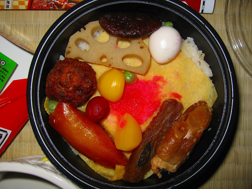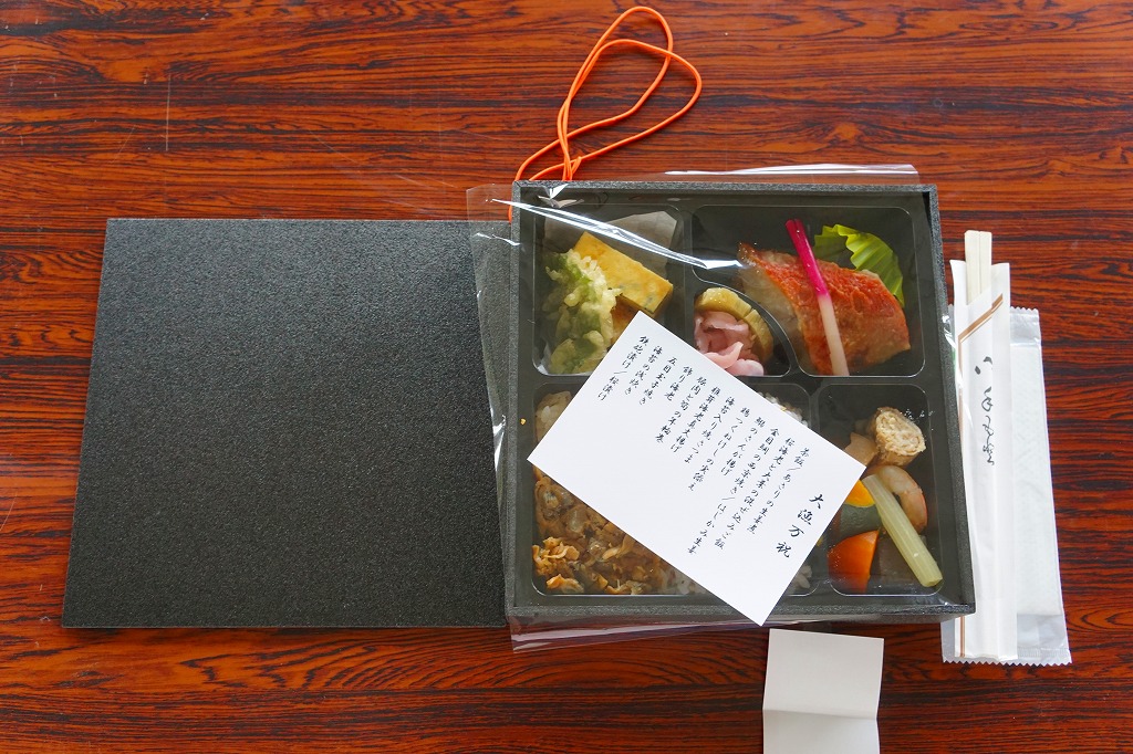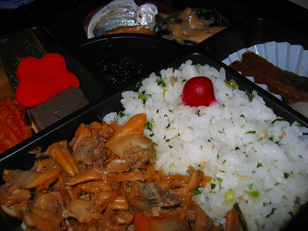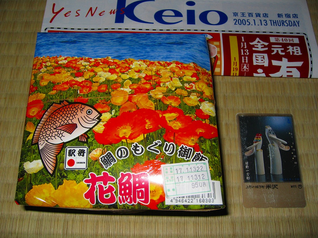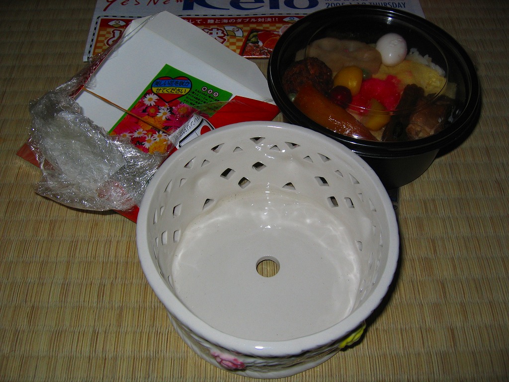 2004(平成16)年12月22日に発売。底や側面に穴が開く白い陶器に、花いっぱいな柄の掛紙をかけて、丸ごとラップで包む。中身は黒いプラ製カップに入っており、鯛の炊き込み御飯の上を薄焼き卵で覆い、鯛の佐倉味噌焼や姫筍の豚巻きや鰯団子などを添える。