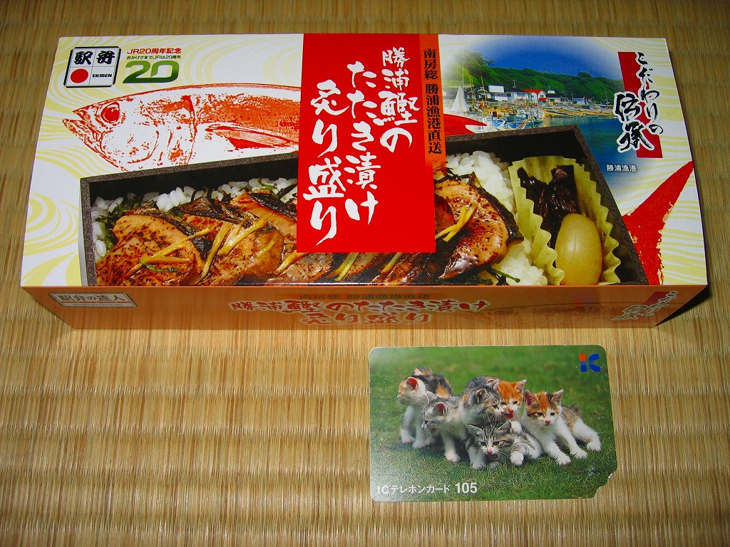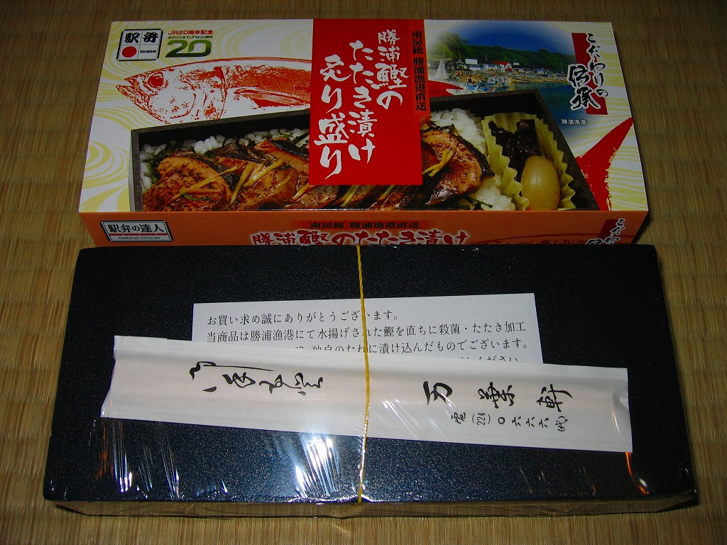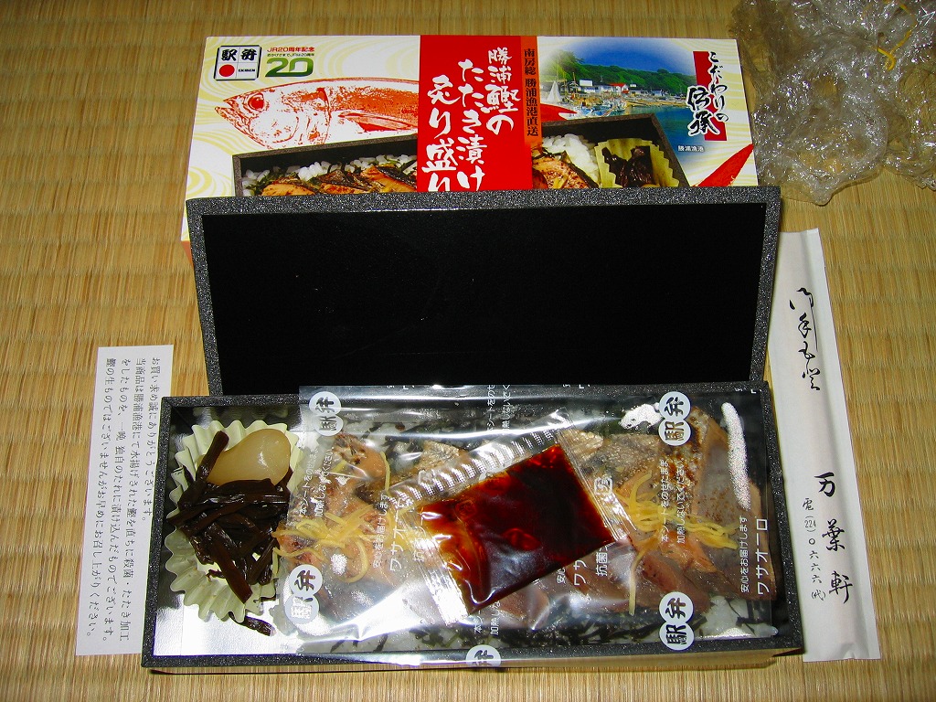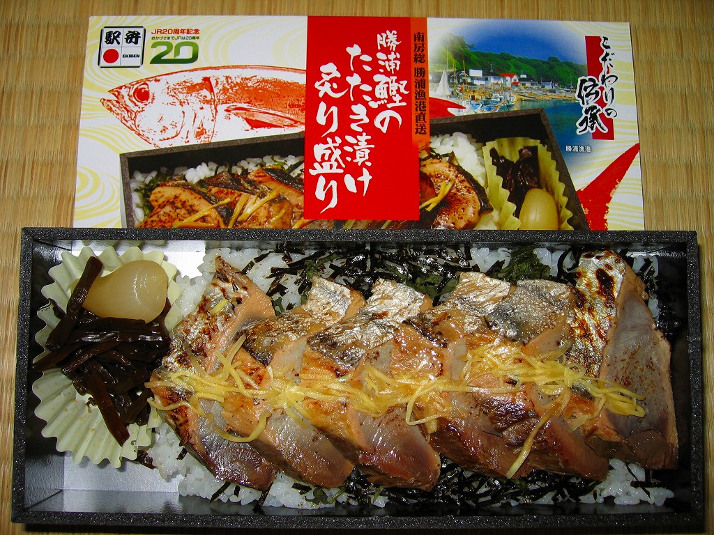 小柄で細長い真っ黒な容器を割りばしごとラップで包み、中身の写真を載せたボール紙の枠にはめる。中身は白御飯の上に駅弁の名前どおり、カツオのたたきを漬けにして炙って盛ったもの。館山の黄金玉らっきょうと、佐原の芋つる佃煮を付合せとして添付。
