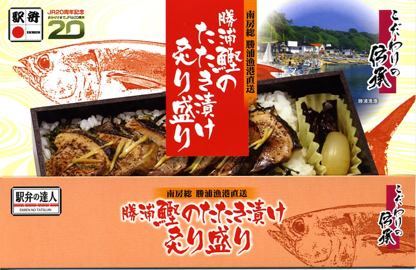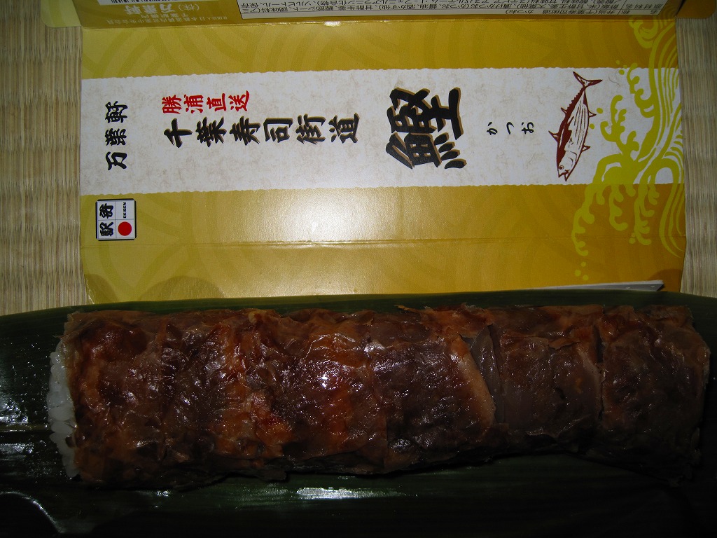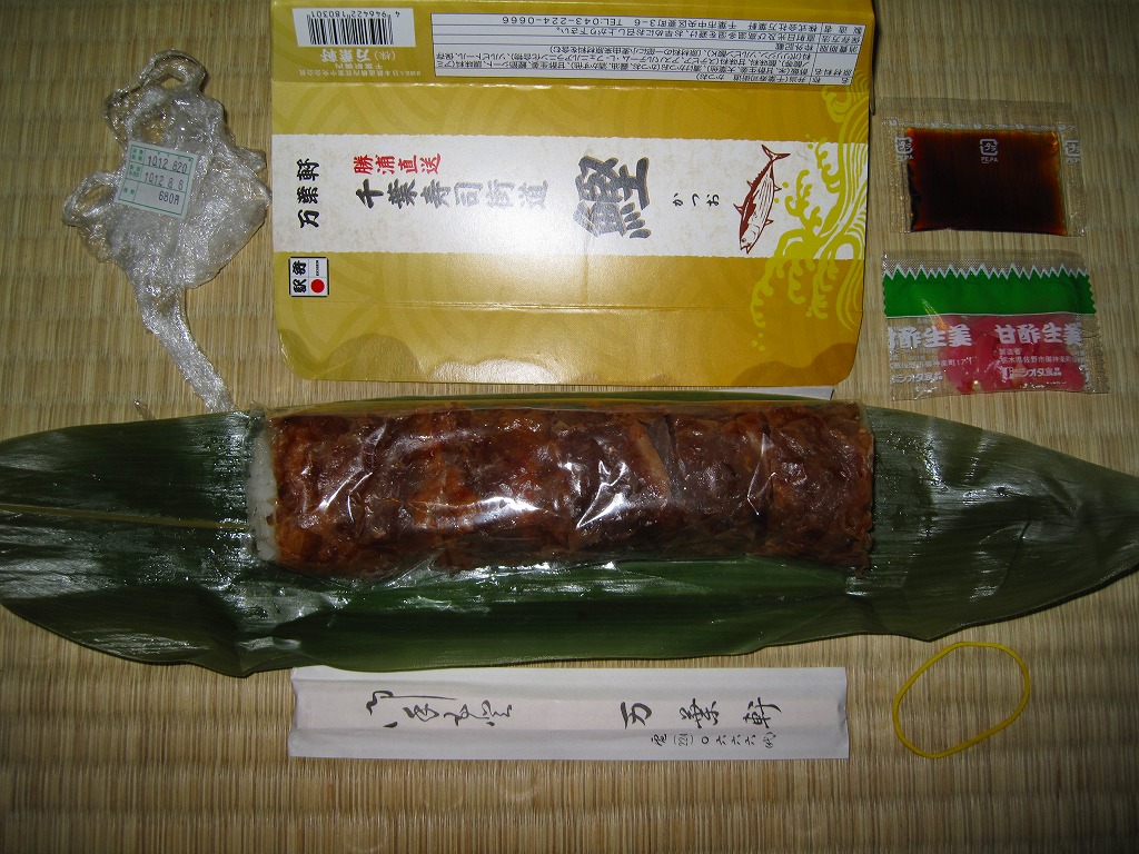2010(平成22)年5月までに発売か。従前の類似品を統合したのか、アジ、タイ、サンマ、イワシとこのカツオで5種のシリーズを組んでいる。こちらは甘酢生姜と大葉を混ぜた円筒状の酢飯に、カツオのヅケとカツオブシシートを半周以上巻き付けて、ビニールで巻いてから笹の葉の上に置き、駅弁の名前を書いた専用の小さなボール紙箱に収めるもの。クセのない旨味を少量安価に凝縮した、帰り道にお手軽な駅弁。2011年度限りで終売か。